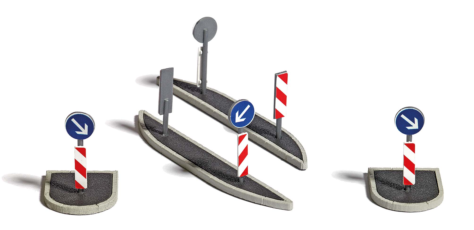 Bausatz für 4 vorbildgetreue Querungsinseln in länglicher und breiter Form. Mit Beschilderung.