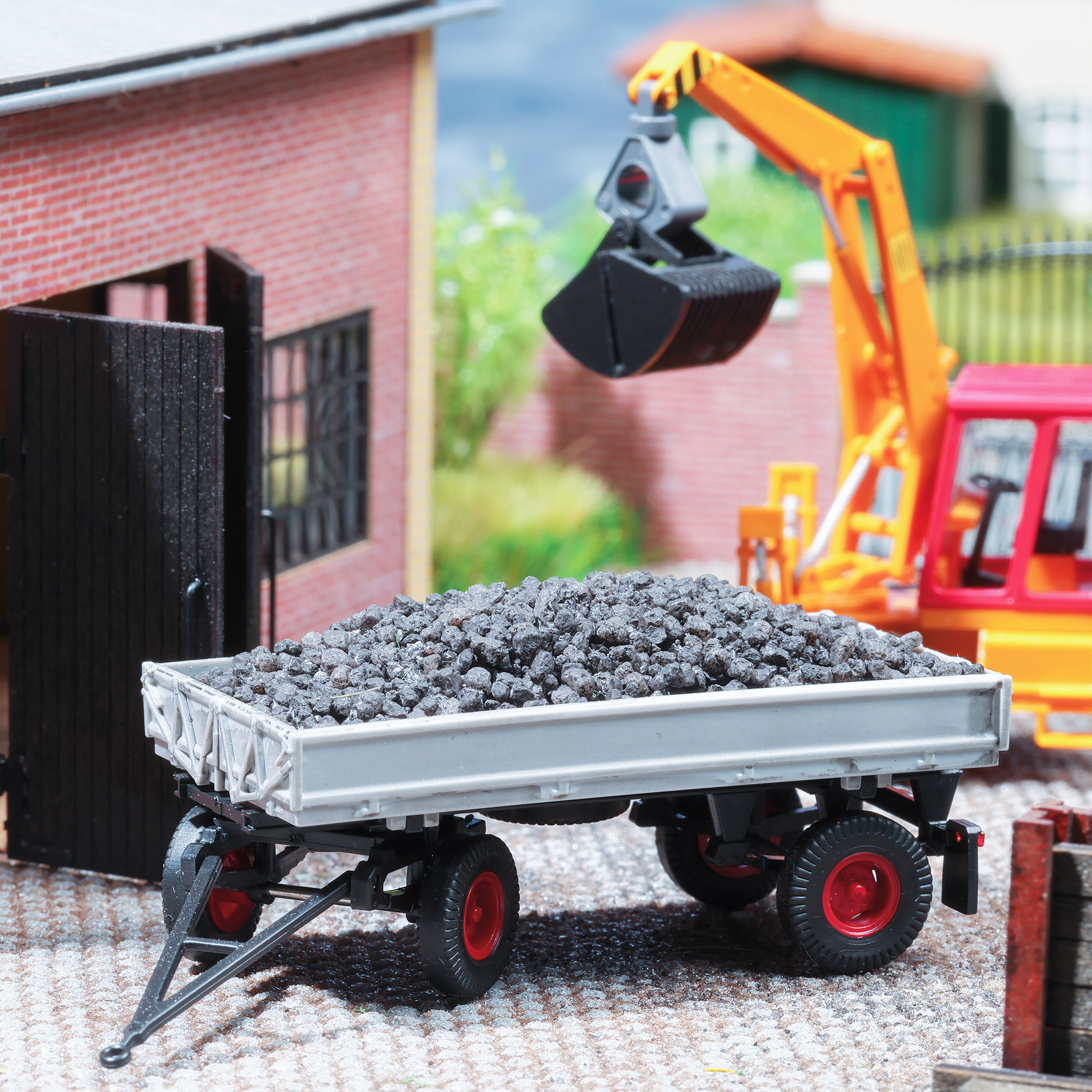 Lagerfläche für Kohle zur Bevorratung an Bahnhöfen, Bahnbetriebswerken, Bergwerken, Binnenhäfen oder Kohlenhandlungen. Basis ist ein Betonsockel, auf dem rundherum 36 Echtholz-Bohlen in die Profile von verrosteten T-Trägern (perfekt nachgebildet) lose als Wandung eingelegt werden. Im Bausatz enthalten ist außerdem »Kohle« zum Befüllen und ein Anhänger IFA HW 60 (Fertigmodell, Farbe kann von der Abbildung abweichen).