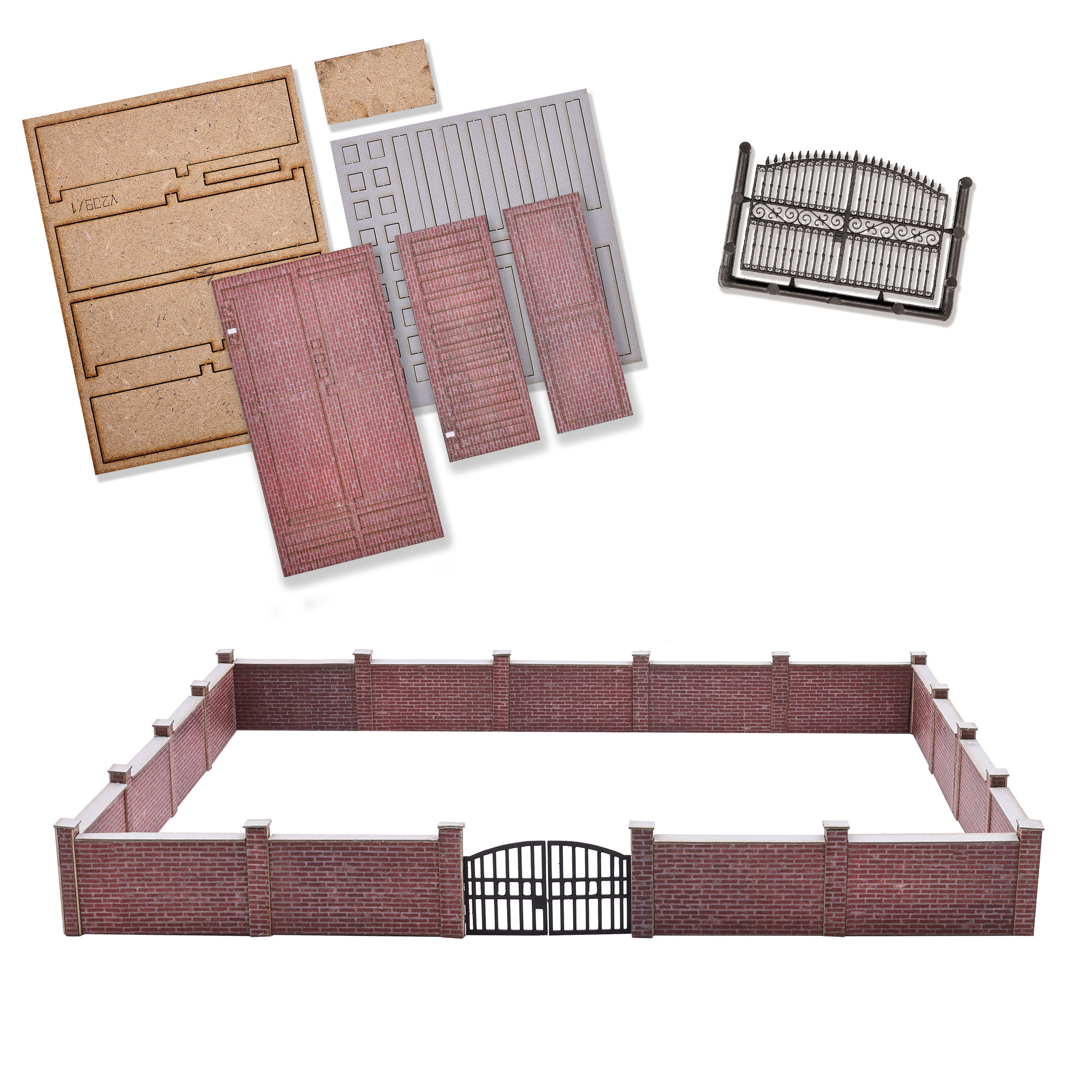 Super-realistische Ziegelmauer zur Einfriedung von privaten und öffentlichen Anlagen und Plätzen. Mit filigranem Tor (Kunststoff) und stabilen Mauerelementen sowie Säulen aus gelasertem Grafikkarton. Inklusive dazu passenden Abdeckungen. Individueller Aufbau möglich. Bausatz.
