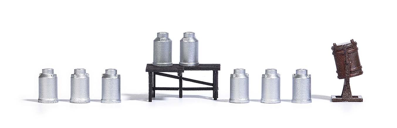 Mit Gestell für die Milchkannen aus echtem Holz, 8 Milchkannen und Butterschleuder. Bausatz.