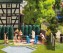 Mit Tisch, vier Plastikstühlen und Standgrill im Stil der 1970-er Jahre. Die Gartenstühle entsprechen dem bekannten »Z-Stuhl« des Gestalters Ernst Moeckl und wurden umgangssprachlich auch als »Hockender Mann« oder »Känguru« bekannt. Oft als »Ost-Produkt« eingestuft, wurden sie aber auch im westdeutschen Raum und international in hohen Stückzahlen vertrieben.