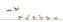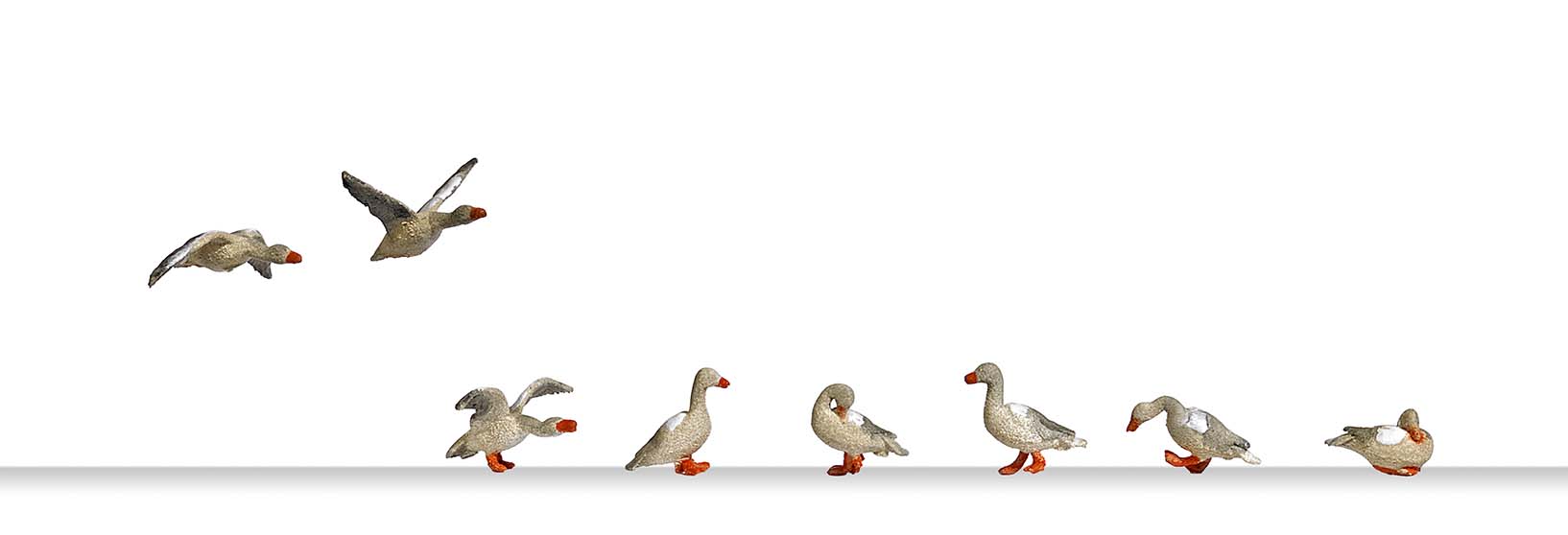 Acht Wildgänse, davon zwei fliegend und eine attackierend.