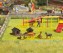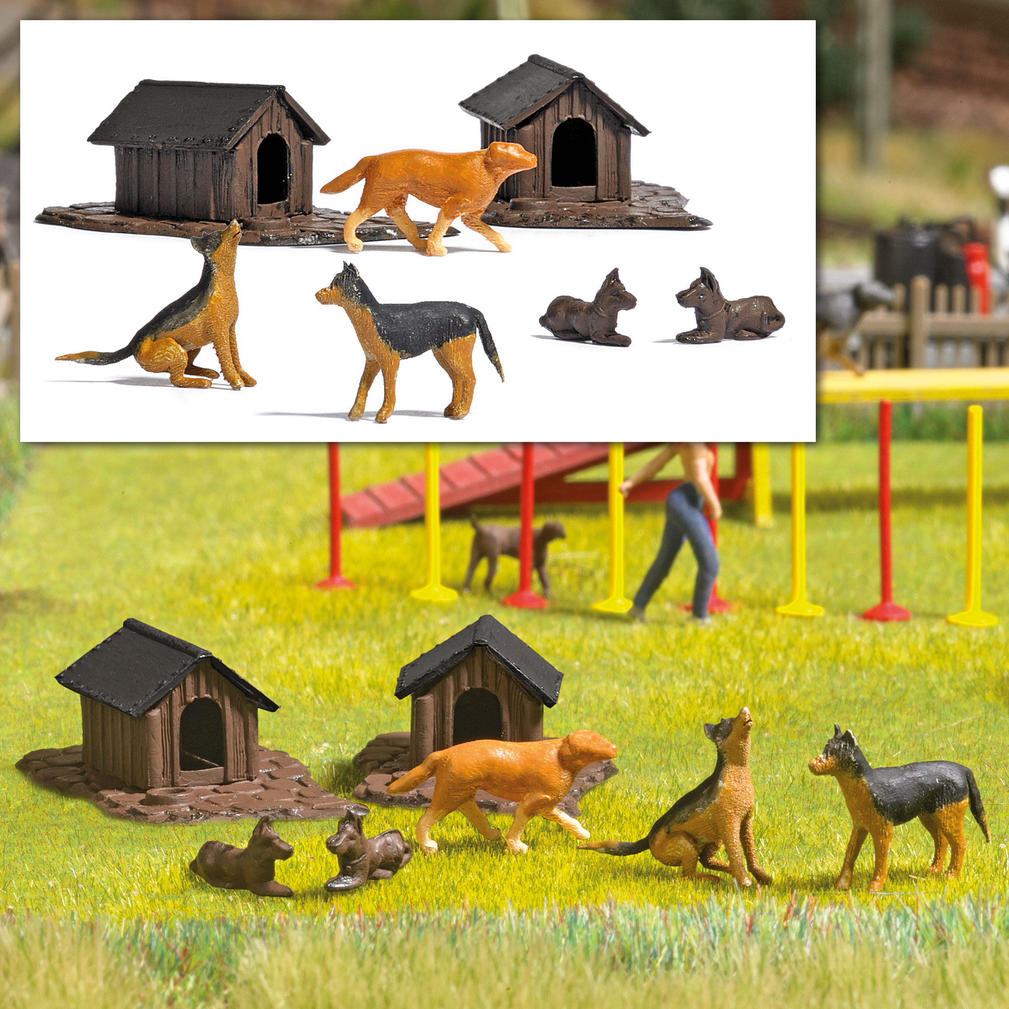 Bausatz für zwei Hundehütten. Mit zwei liegenden Hunden, zwei laufenden Hunden und einem sitzenden Hund. Größe der Hütten jeweils: 15 x 11 mm, Höhe: 10 mm.