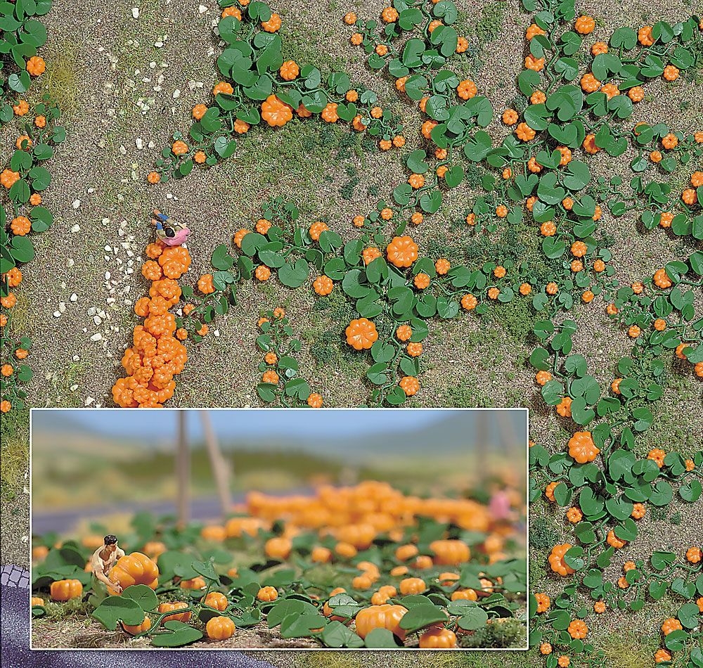 Das Anlegen eines Kürbisfeldes ist ganz einfach: Untergrund mit Busch Ackerfolie 7256 bekleben oder mit Modelliersand 7552 gestalten. Dann wenig Microflocken (7322) und Grasfasern (7111) als ?Unkraut? aufkleben. Die Kürbisse auf dem Feld in sternförmigen Anordnungen verteilen (großer Kürbis in die Mitte, die kleineren Kürbisse "drumherum") und zum Schluss die Blätterranken (ebenfalls sternförmig) aufkleben. Der passende Kürbisverkaufsstand ist mit den neuen Verkaufsbuden (1055) schnell gebastelt