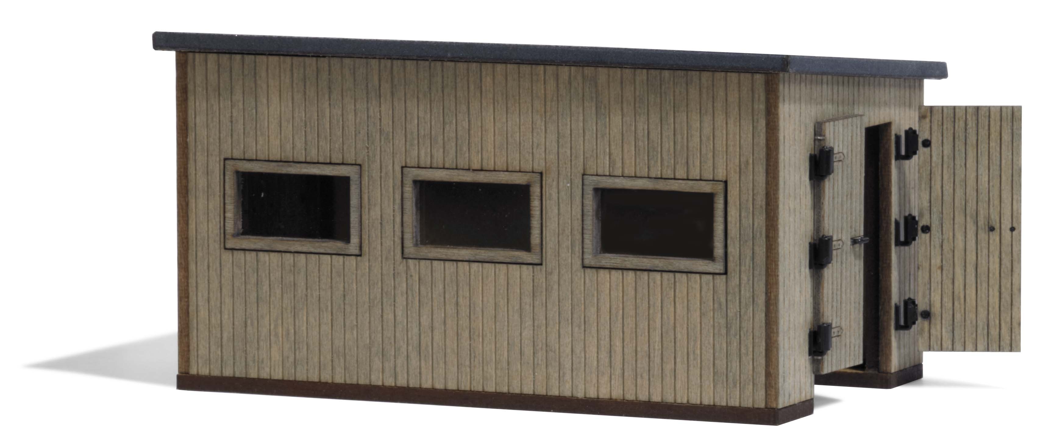 Holzschuppen für Feldbahn- und Industrieloks. Der Lokschuppen war im Original zerlegbar, um von Baustelle zu Baustelle transportiert werden zu können. Das Profil der Holzlatten ist bei dem kompakten Gebäudemodell perfekt nachgebildet. Wie bei dem großen Vorbild, das bei der Tiefbau-Firma Heinrich von Bloh in Bad Zwischenahn im Einsatz war, besitzt der Lokschuppen an beiden Frontseiten Holztore zum Öffnen.