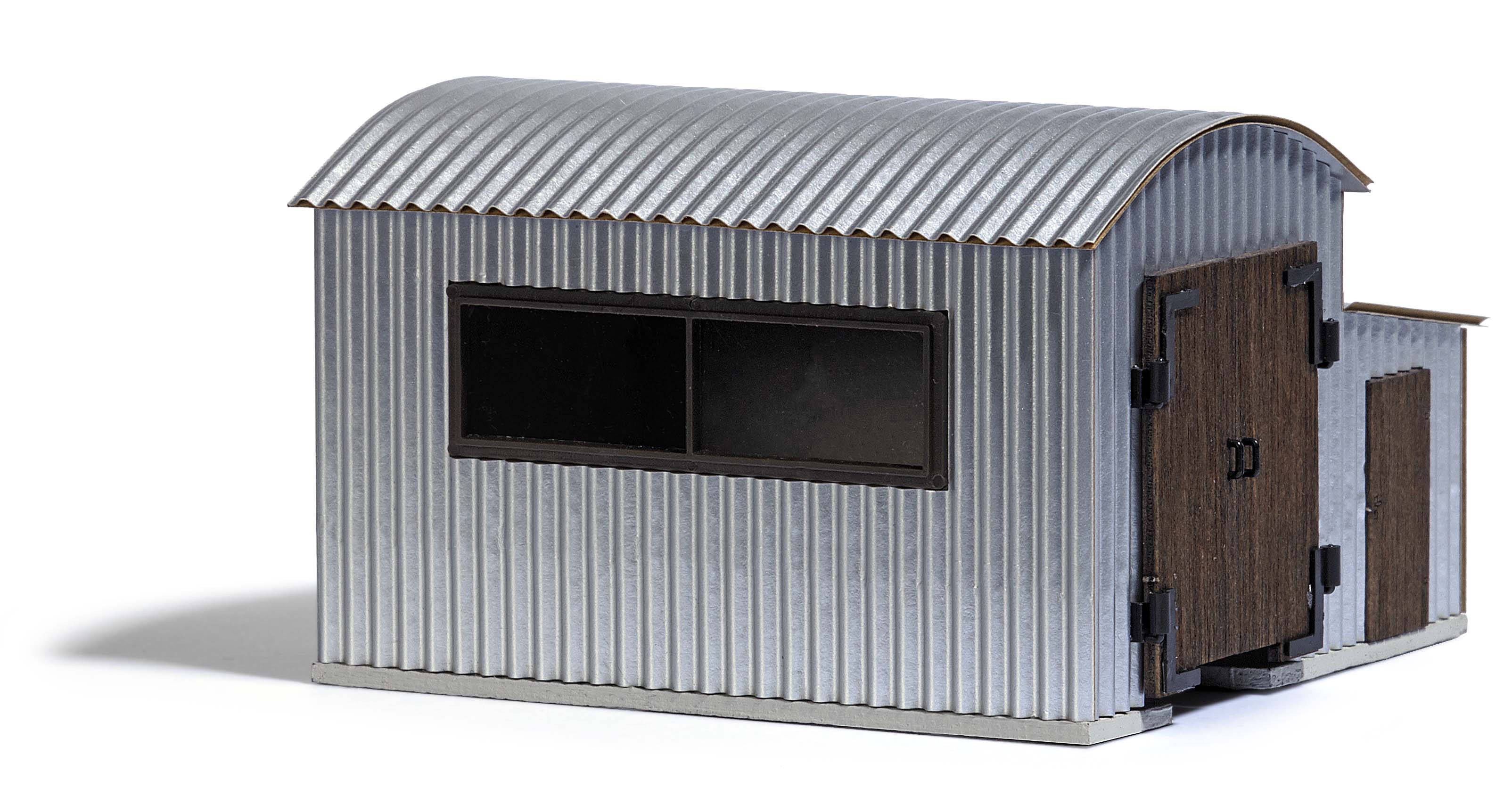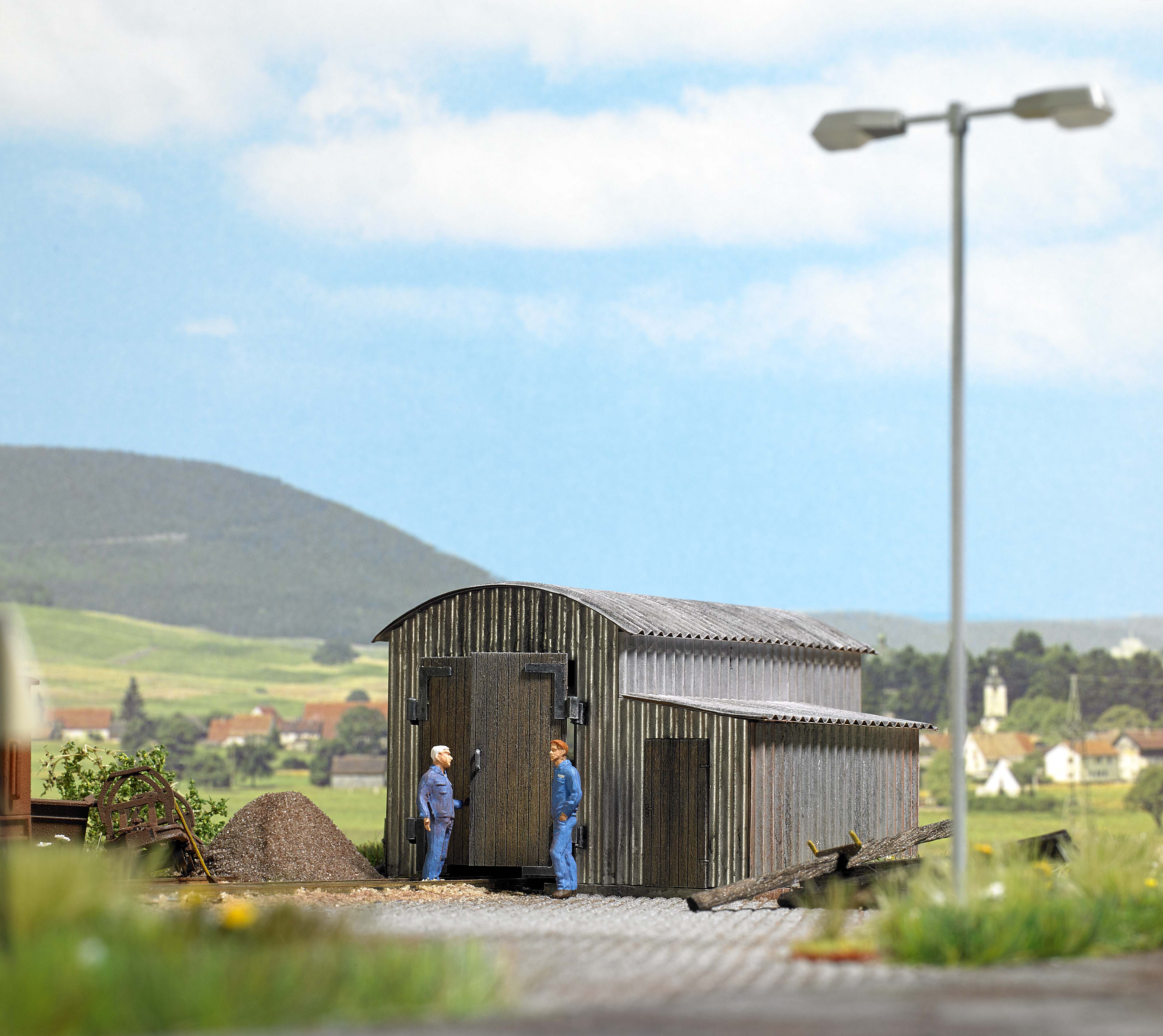 Bausatz für einen Wellblechschuppen mit Anbau. Für Feld- und Industriebahnloks. Die Einfahrt (24 mm breit, 31 mm) ist mit einem doppelflügeligen Holztor zum Öffnen versehen. Aussparung im Boden des Schuppens für das Busch Feldbahngleis (Länge im Inneren: 56 mm). Größe: 68 x 67 mm, 39 mm.