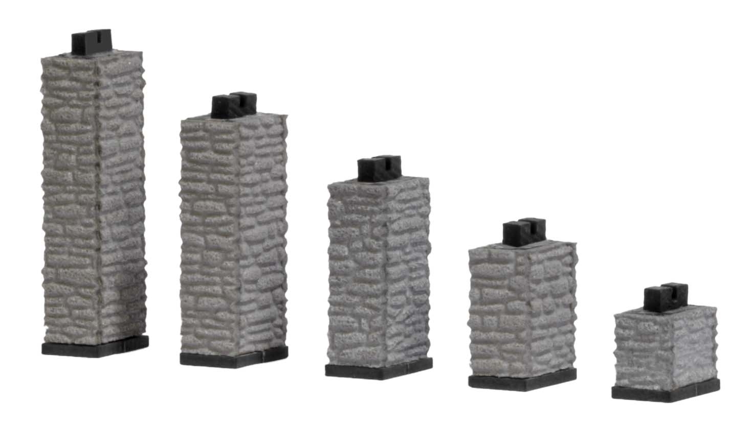 Inhalt: 5 Brückenpfeiler ca. 13, 21, 29, 37 und 46 mm hoch. Passend für Brückenelemente 12385 bzw. 12386 für gerade oder gebogene Feldbahngleise.