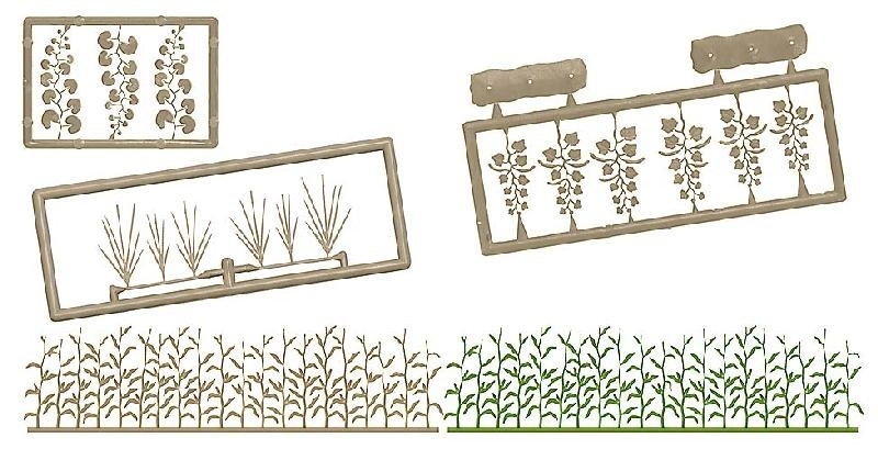 Blätter- und Pflanzenstängel in verschiedenen, spätsommerlichen Farbtönen zur Gestaltung von Gestrüpp in verwilderten Gärten, an Wegesrändern, Zäunen usw. Bausatz.