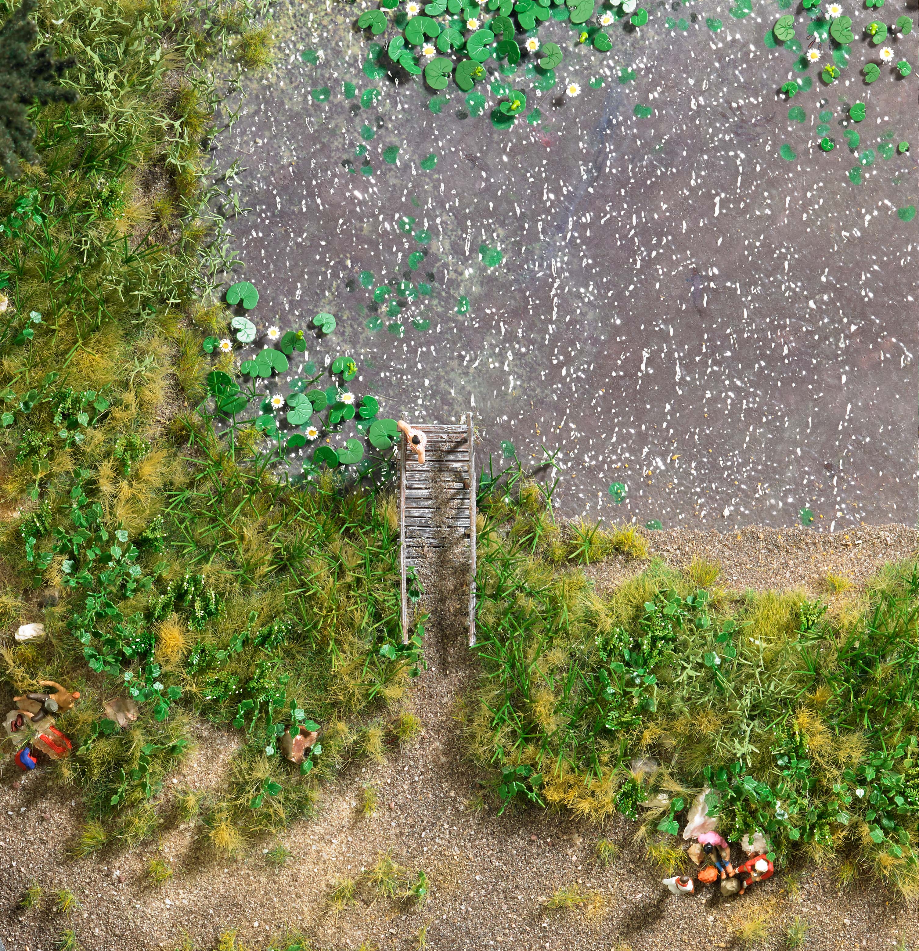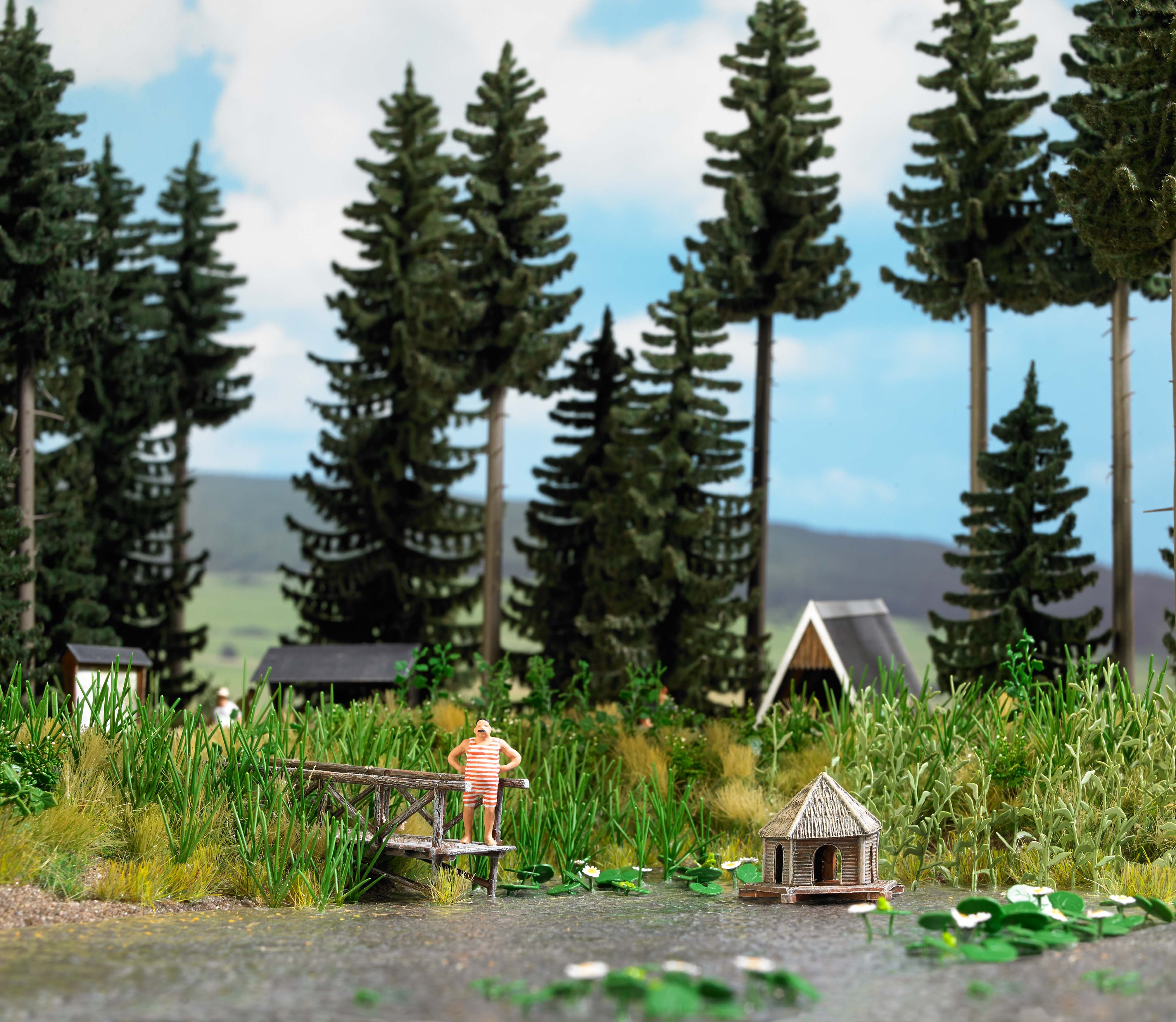 Set zur Gestaltung eines realistischen Waldteichs. Die spezielle Teichfolie mit Tiefenwirkung zeigt verblüffende Details: Unter der Wasseroberfläche sind schwimmende Fische und Wasserpflanzen zu erkennen. In Verbindung mit der beigefügten Wasserfolie (138 x 192 mm) ergibt sich eine verblüffend echt wirkende Teichoberfläche. Für die weitere Gestaltung enthält das Set Seerosenblüten und Seerosenblätter, Schilfpflanzen, Bausätze für einen Holzsteg und ein Entenhaus sowie Sand, Steine und Groundcover für die Ufergestaltung. Außerdem zahlreiche Kleintiere für das Leben am Teich: Frösche, Schlangen, Ratten, Käfer, Salamander, Schmetterlinge und Fische. Komplett mit Spezialnadel zum einfachen »Pflanzen« der verschiedenen Gewächse und detaillierter Anleitung.