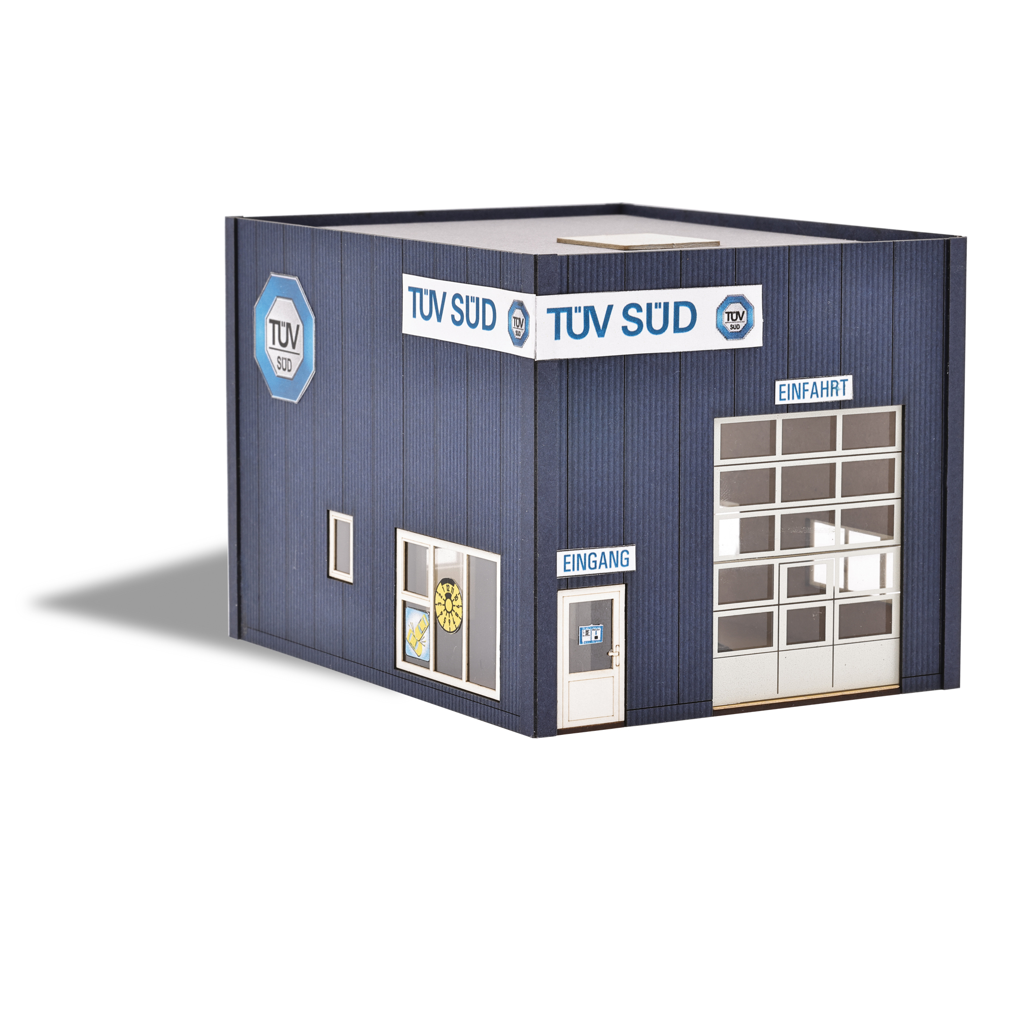 Bausatz für eine standardisierte, moderne Kfz-Halle mit großem Rolltor, Eingangstür