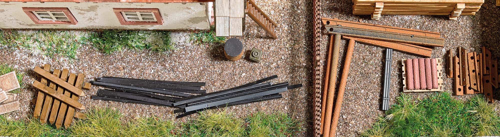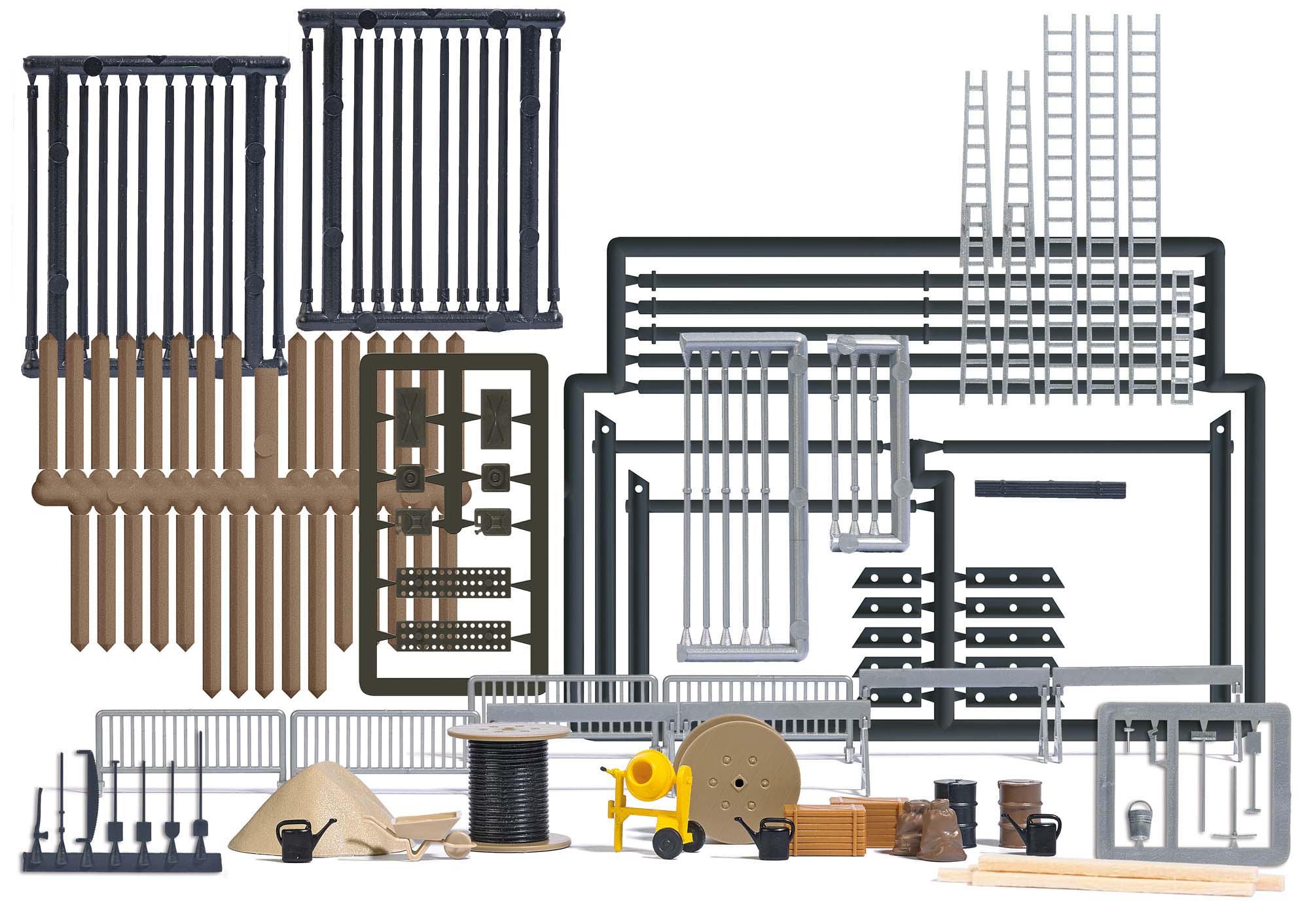 Reichhaltiges Set zur Ausgestaltung von Baustellen mit: Werkzeug, Kabeltrommel, Holzbohlen, Holzkisten, Fässern, Kannen, T-Trägern, Leitern, Schubkarren, Sandhaufen, Absperrgittern, Säcken, Pfosten, Kanistern, Werkzeugkisten, Sandblechen und Betonmischmaschine.