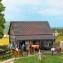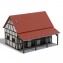 Bausatz für eine ländliche Stallung mit drei Pferdeboxen in einem attraktiven Gebäude mit Anbau und Fachwerk aus echtem Holz. Die Gefache (Raum zwischen den Holzbalken) bestehen im Modell aus einem Spezialkarton, der entsprechend farblich