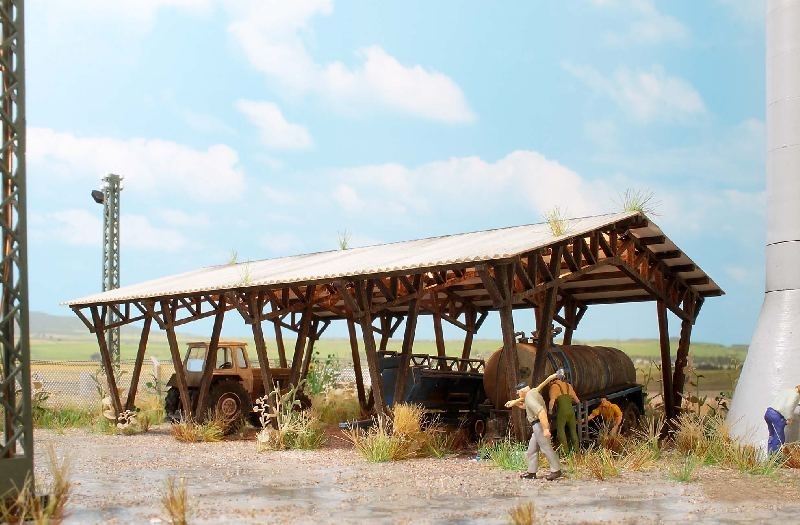Dieser Unterstand zum Schutz von landwirtschaftlichen Fahrzeugen und Gerätschaften war weit verbreitet in den LPGs (Landwirtschaftliche Produktionsgenossenschaften der DDR) sowie auf westdeutschen Bauernhöfen. Auch heute werden diese vielseitig einsetzbaren Unterstände für Fahrzeuge in der Landwirtschaft verwendet oder als Materiallager für Baufirmen, als Wetterschutz für den Fuhrpark städtischer Bauhöfe u.v.m. Echt-Holz-Modell. Bausatz.