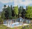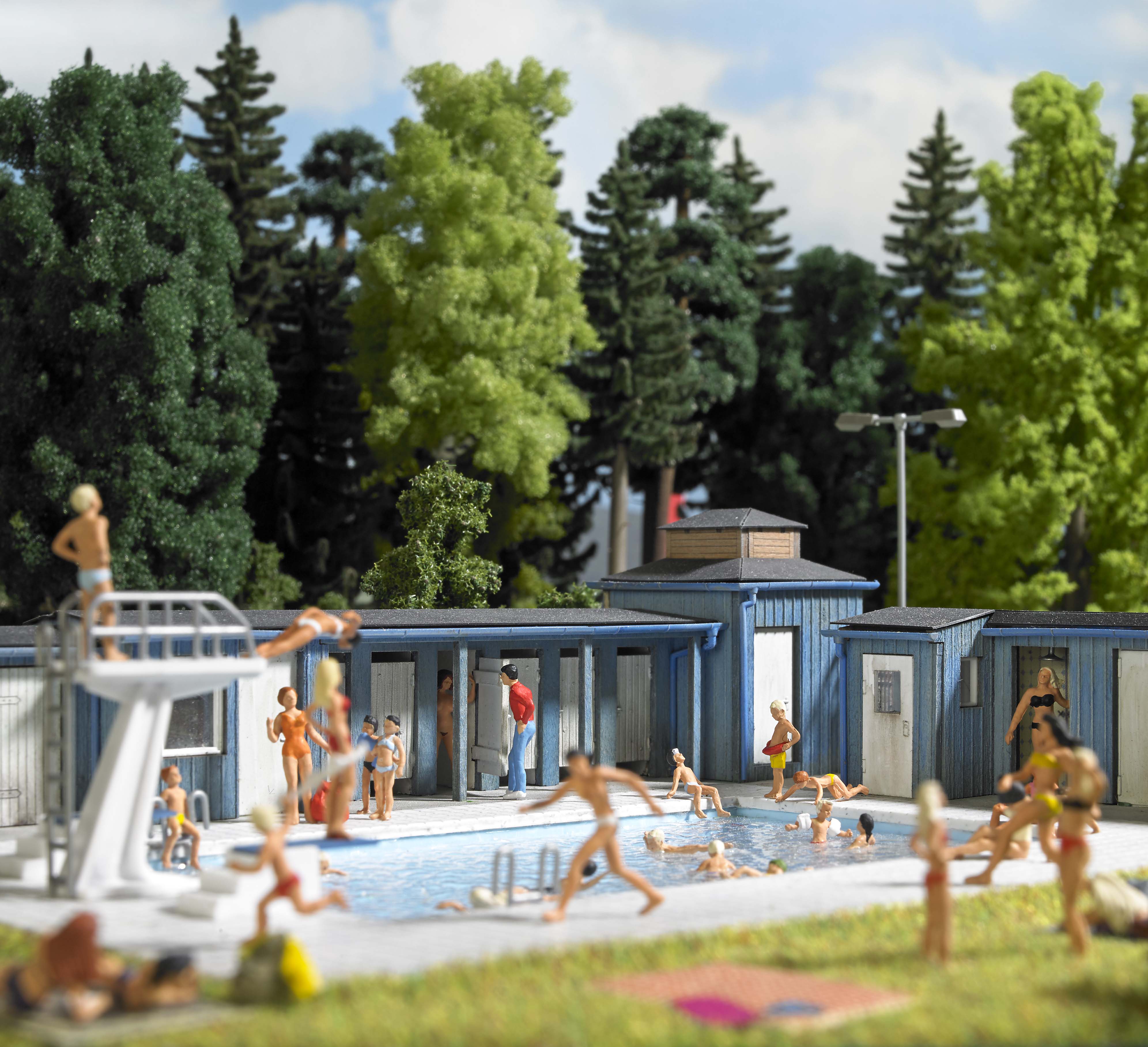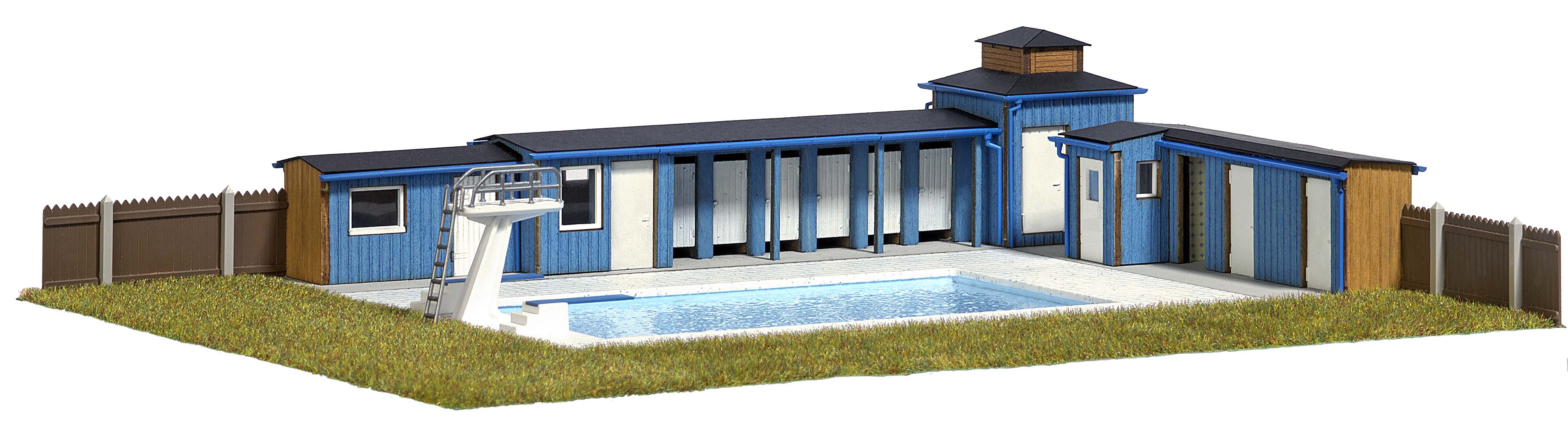 Komplettes Freibad in Holzbauweise mit Kassenhaus und filigranem Metalltor, Umkleidekabinen, Duschen, Toiletten, Betriebsräumen, Bademeisterkabine und Geräteschuppen. Bereits farbig koloriert. Großes Schwimmbecken mit realistischer Wasseroberfläche, Sprungtürmen, Liegewiese und Umzäunung. Bausatz in Anlehnung an das noch existierende Freibad in Mylau in Sachsen.
