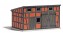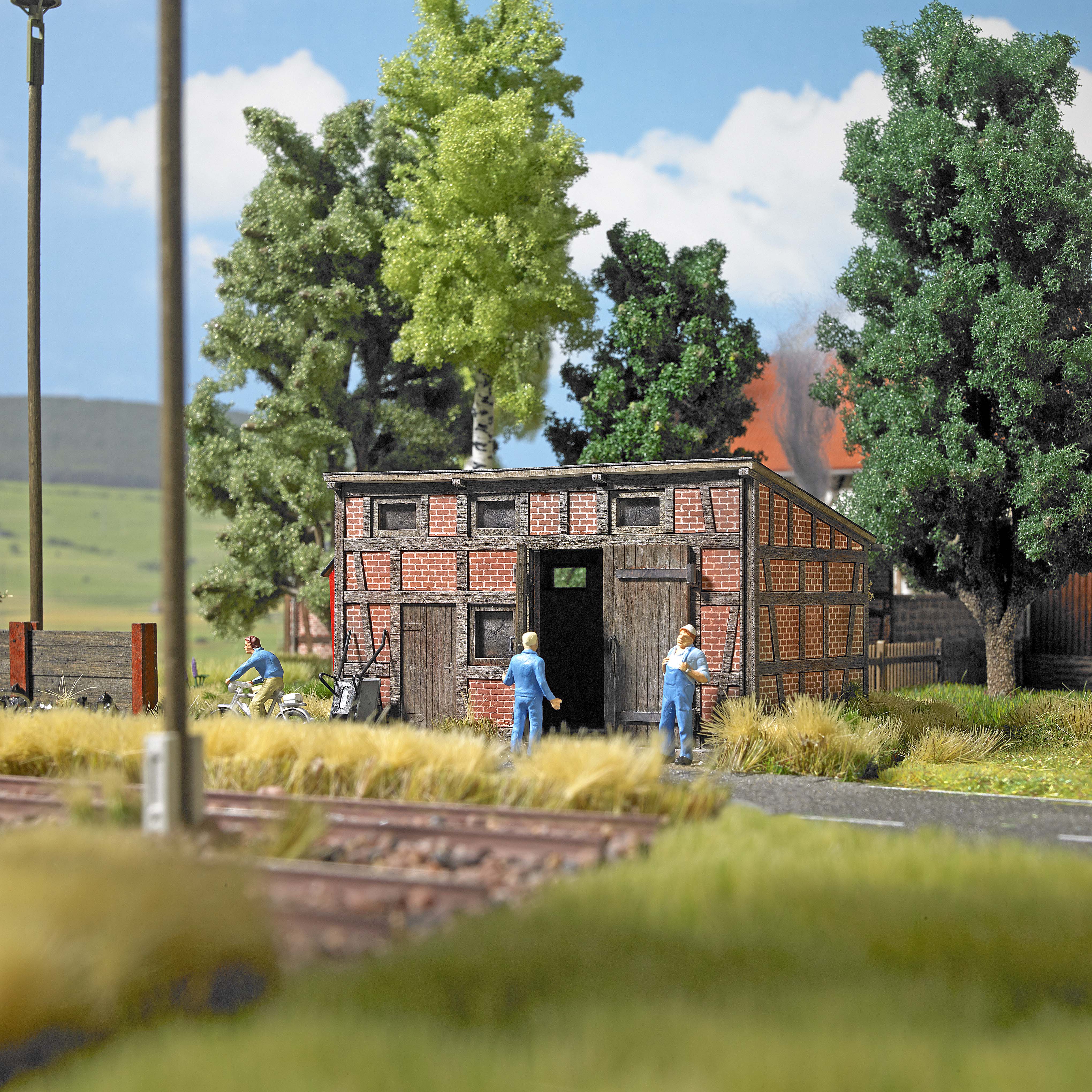 Bausatz. Älteres Hinterhofgebäude in Ziegel/Fachwerkbauweise. Fachwerk, Tür und Tor aus echtem Holz. Bereits fertig koloriert. Realistische Dacheindeckung. Universell einsetzbar z.B. als Werkstatt, Garage, Wäscherei, für Bahnbetriebswerke und Bekohlungsanlagen usw. Maße: 85 x 58 mm, 47 mm.