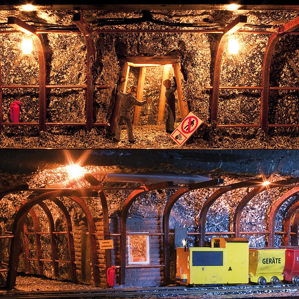 Set für die Innengestaltung eines Bergwerkstollens (Bausatz). 24 Rundbögen mit passenden Verstrebungen für die Abstützung von ca. 60 cm Stollengang (teilweise sind die Rundbögen angeschnitten, so dass man in den Stollengang hineinsehen kann). Außerdem enthält das Set Material für den Bau einer Steiger-Stube (Büro für die Bergbauaufsicht) und einer Wettertür (zur Belüftungsregulierung in den Schächten). Weiterer Inhalt: 10 Rundhölzer (für Abstützungen, als Rohrattrappen u.ä.), Elektrokasten, Feuerlöscher, Kisten, Schweißgerät, Leitern, Handräder (zum Öffnen oder Schließen von Ventilen), Treppe, Sandhaufen, Schubkarren, Werkzeugwagen, Werkzeugkiste, div. Werkzeug und Ausschneidebogen mit typischen Schildern, Warnhinweisen usw.