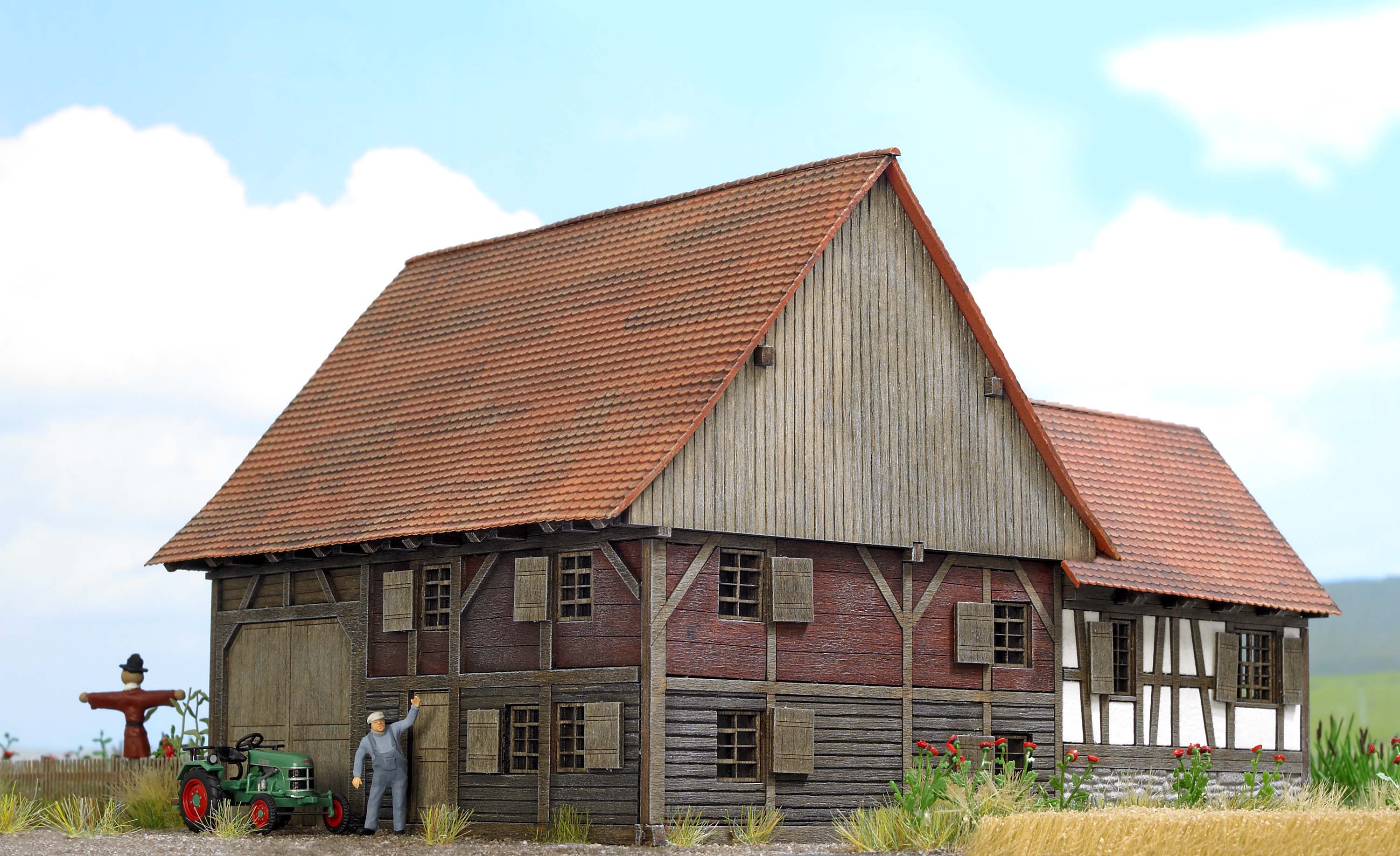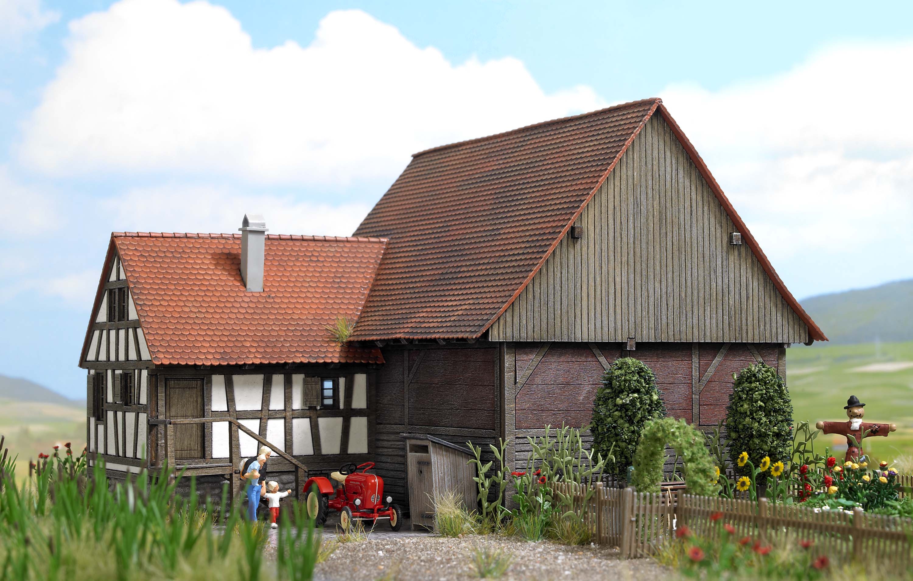 Mit diesem Bausatz nach einem Vorbild aus dem Baden-Württembergischen Ort Mennwangen wird ein so genanntes »Seldnerhaus« dargestellt. In der Dorfhierarchie unterhalb der Bauern angesiedelt, verdienten die Seldner ihren Lebensunterhalt mit gepachteter Landwirtschaft, waren aber auf zusätzliche Lohnarbeiten mit zum Teil geliehenen Gerätschaften angewiesen. Die Gebäude der Seldner waren einfach und zweckmäßig. Dieses zweigeschossige Kleinbauernhaus ist im Freilichtmuseum Neuhausen (www.freilichtmuseum-neuhausen.de) rekonstruiert worden und zu besichtigen. Die Scheune des zweiteiligen Gebäudes ist wie im Original in Echtholz ausgeführt, auch das Fachwerk des angebauten Wohnbereiches mit den filigranen Fenstern und der Holztreppe ist bereits fertig in Holzfarbe gebeizt. Vorbereitet zum Einbau einer Innenbeleuchtung (Beleuchtungssockel 4280).