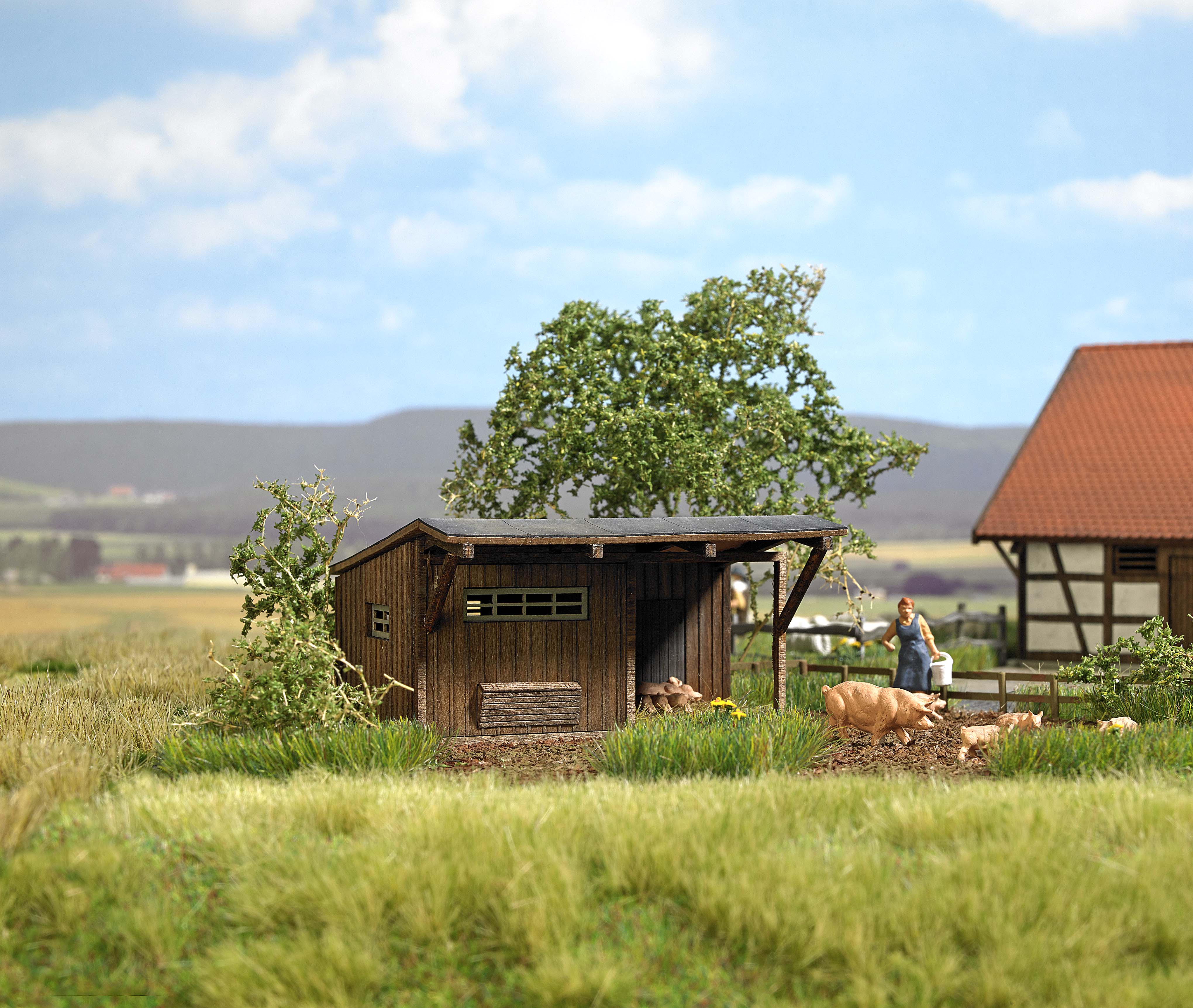 Typischer Schweinestall in Echt-Holz-Bauweise, alle Teile fertig koloriert. Das Original steht im Freilichtmuseum Neuhausen ob Eck (in der Nähe von Tuttlingen). Der Dachüberhang an der Vorderseite gewährt die witterungsgeschützte Futteraufnahme am Trog. Seitlicher Eingang mit Holzboden, der von den Schweinen bei gutem Wetter gerne als Sonnenterrasse genutzt wird.