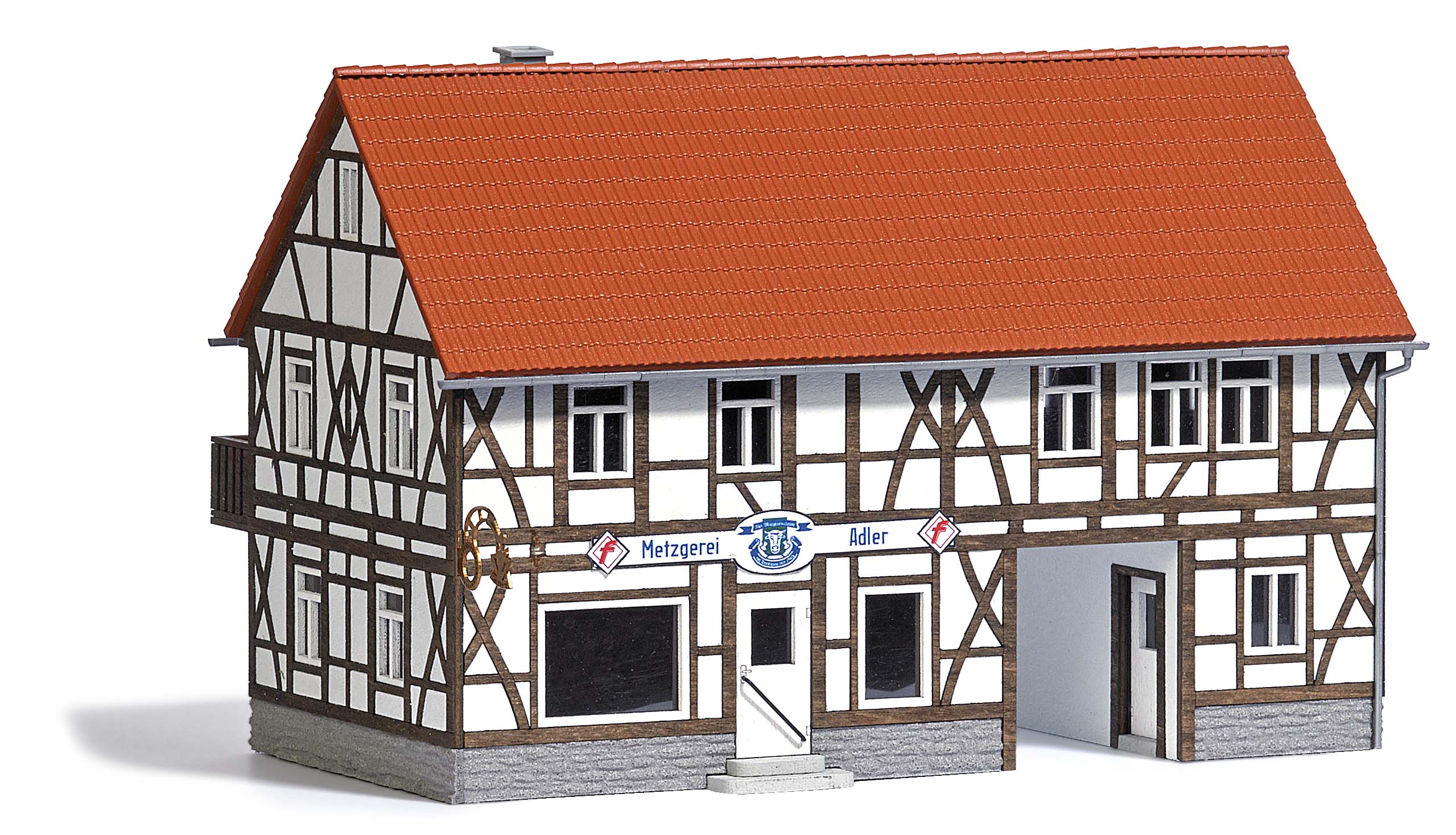Bausatz für ein Fachwerkgebäude mit Metzgerei. Echtes Holzfachwerk, inkl. Holzbalkon auf der Rückseite. Alle Teile fertig koloriert. Realistische Nachbildung der Gefache mit Putzstruktur. Mit Durchfahrt z.B. zu einem Hinterhof (ideale Erweiterung: Hinterhofgebäude H0 1531). Filigrane Nachbildung des schmiedeeisernen Innungsschildes. Regenrinnen und Fallrohre detailliert aus Kunststoff. Ausschneidebogen mit vielen passenden Motiven. Vielseitig verwendbar für verschiedenste Ladengeschäfte, als Molkerei und z.B. auch als Bauernhof-Direktverkauf. Vorbereitet zum Einbau einer Innenbeleuchtung. Größe: 150 x 80 mm, 100 mm. Durchfahrt: 25 x 30 mm.