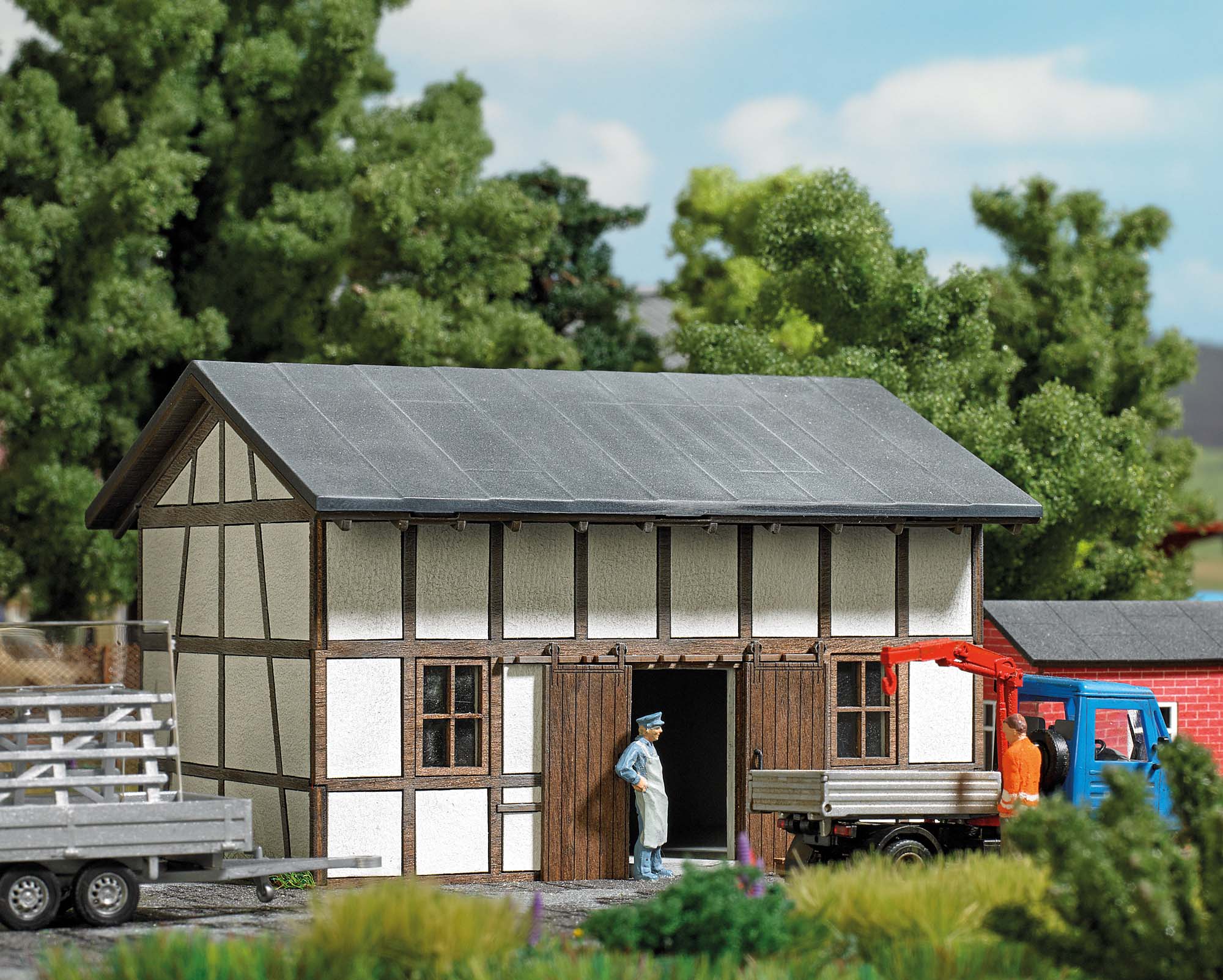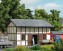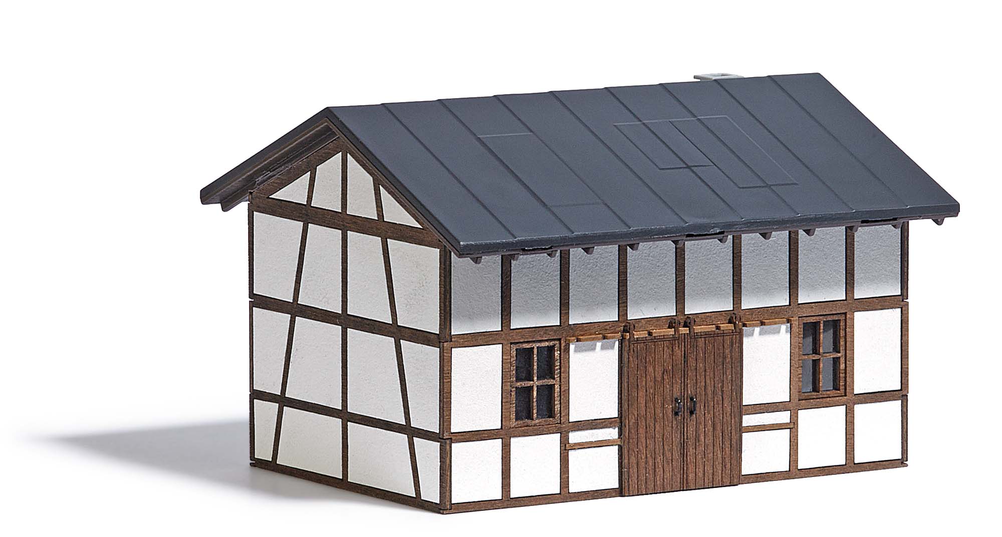 Fachwerk, Fenster und zweiflügeliges Holztor sind aus echtem Holz, alle Teile sind koloriert. Bausatz ist beleuchtbar mit Busch Led´s 5998.