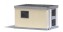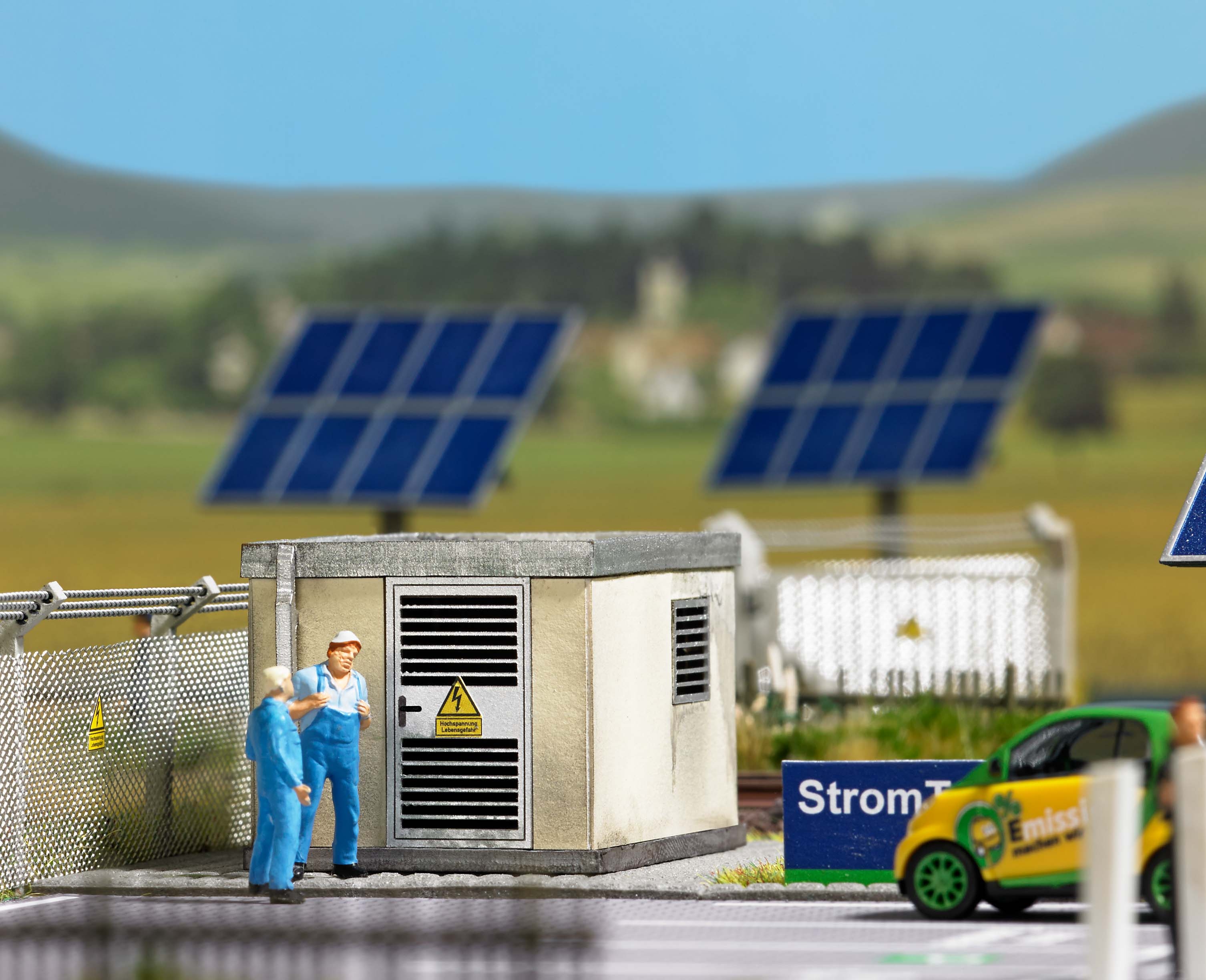 Bausatz für ein kompaktes Stromhäuschen in moderner Bauweise mit Flachdach und Kieseleindeckung. Detaillierte Darstellung von Metalltür, Lüftungsgitter und Fallrohren. Mit passenden Warnhinweisen zum Ausschneiden (»Achtung, Hochspannung!« usw.).