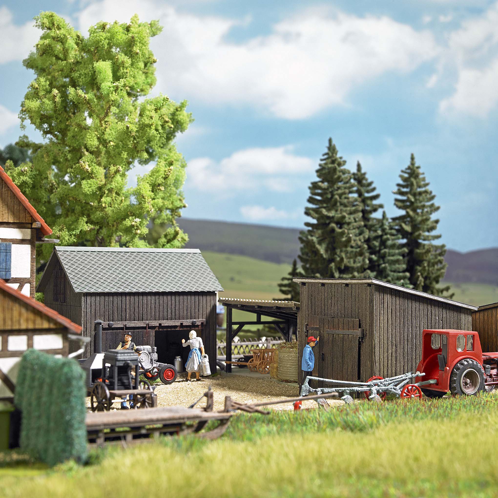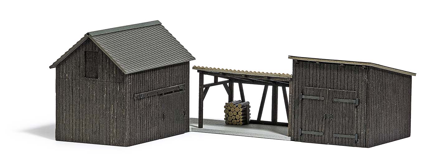 Schuppenkomplex mit kleiner Scheune, Unterstand und Flachdachschuppen, die über Eck angeordnet sind. Mit vielen Echt-Holzteilen. Scheune mit Tor, das auch in geöffnetem Zustand zusammengebaut werden kann (Toröffnung 25 x 21 mm). Unterstand in Holzständerbauweise mit Welldacheindeckung. Flachdachschuppen mit schrägem Dach und Doppeltor zum Öffnen (29 x 26 mm), filigranen Scharnieren und Türgriffen. Zusätzlich Holzstapel enthalten. Bausatz. Größe Scheune: 72 x 46 mm, 58 mm hoch. Größe Unterstand: 58 x 41 mm, 35 mm hoch. Größe Flachdachschuppen: 56 x 47 mm, 45 mm hoch. Innenlänge: 44 mm.