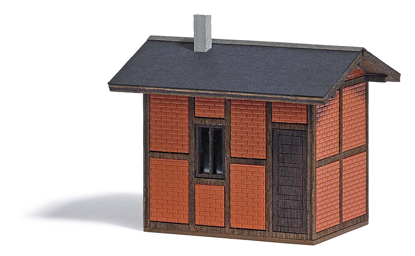Rangiererhäuschen in Ziegel-/Fachwerk-Bauweise. Fachwerk, Fenster und Türen