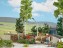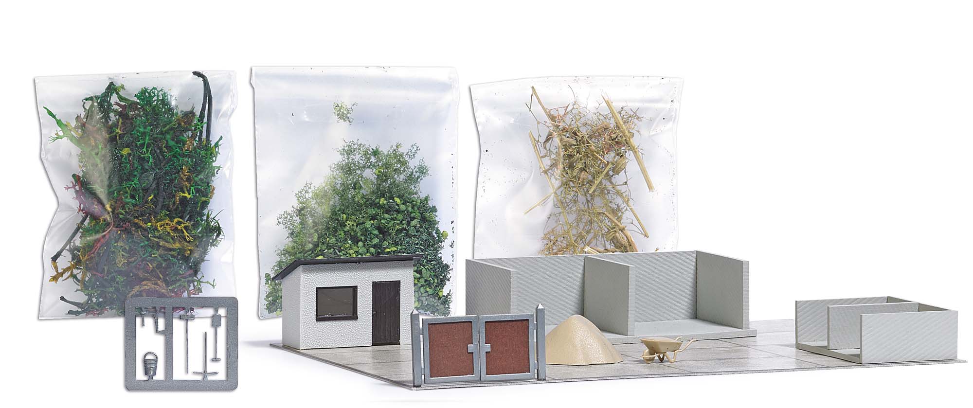 Bausatz für eine komplette Grünschnitt-Sammelstelle mit Wärterhäuschen, Sammelboxen, Betonbodenplatte(116x119 mm), Umzäunung mit Toren, Sandhaufen, Schubkarren, Werkzeug und Belaubungsmittel als Grünschnitt.