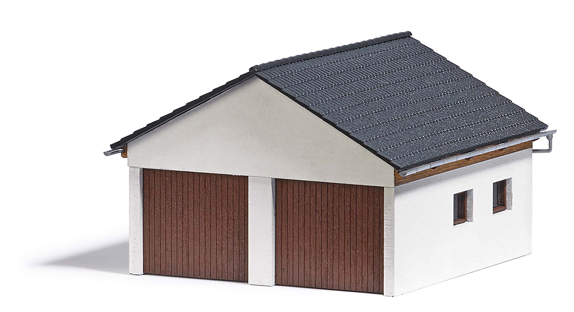 Moderne Doppelgarage mit 2 großen Holztoren. Ein interessantes Detail sind die sichtbaren Wandpfetten an den Seiten des Gebäudes, auf denen die Dachsperren aufliegen und die auch aus echtem Holz gefertigt und bereits koloriert sind. Bausatz.