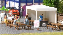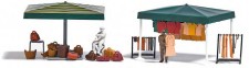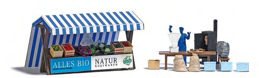 Marktstand (Länge 50 mm) aus echtem Holz mit reichhaltiger Ausstattung: verschiedene Gemüsesorten und Kisten, Fässer, Säcke,