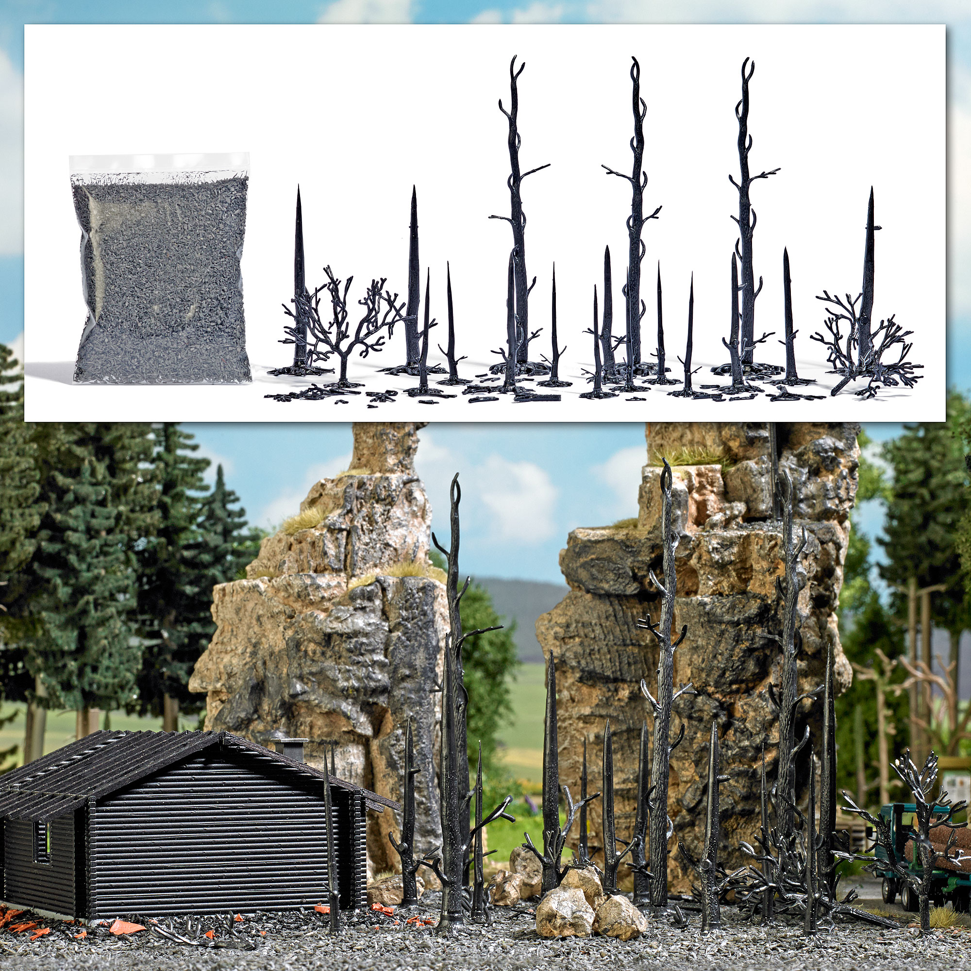 50 mm, verbranntes Geäst sowie Streumaterial für verbrannten Waldboden. Bausatz.