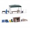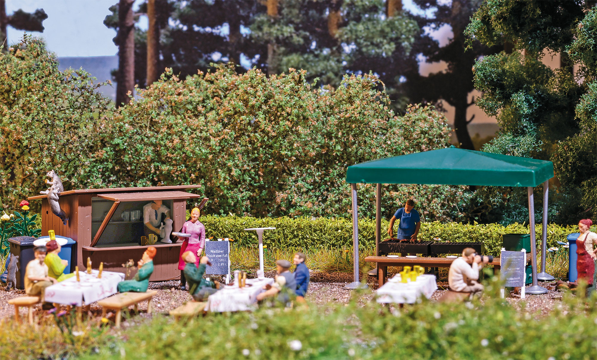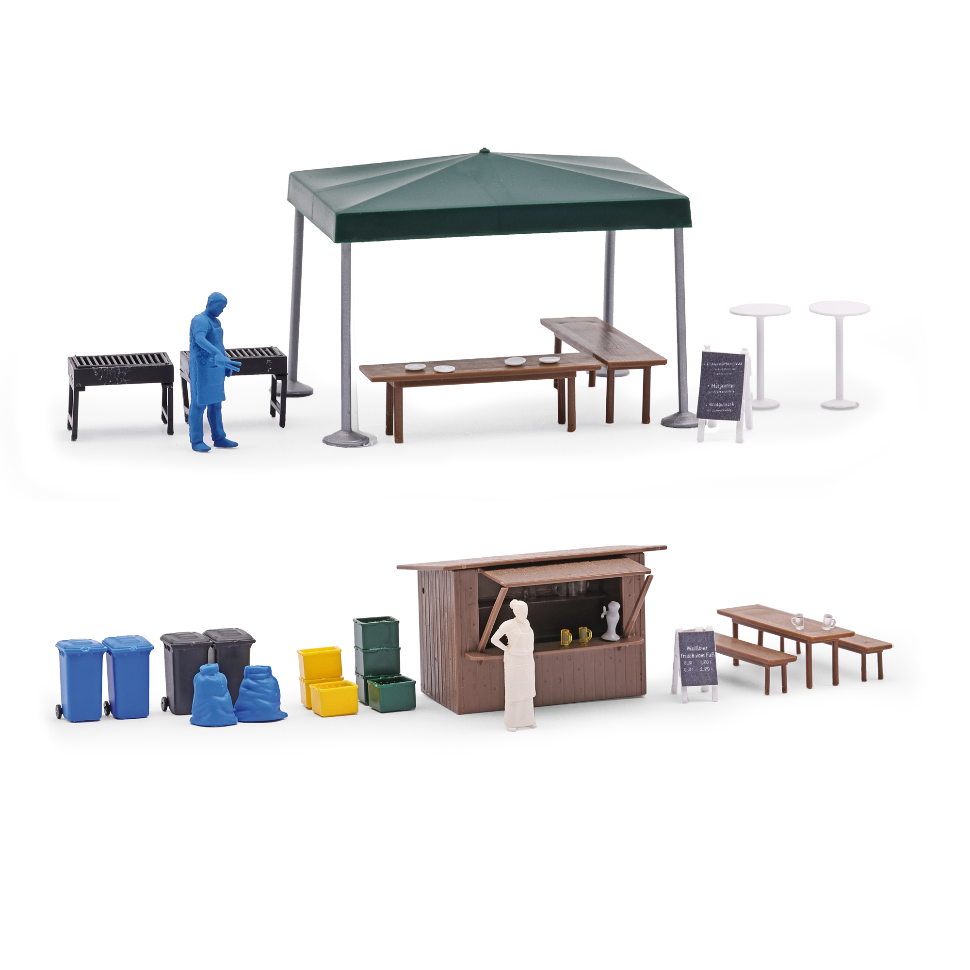Umfangreiches Ausgestaltungsset für Feste aller Art in freier Natur. Inhalt: zwei Figuren zum Selbstbemalen, Verkaufsbude, Pavillon, Bierzeltgarnituren, Stehtische, Stehgrills, Verkaufsschilder, Geschirr, Kisten, Mülltonnen und Müllsäcke. Bausatz.