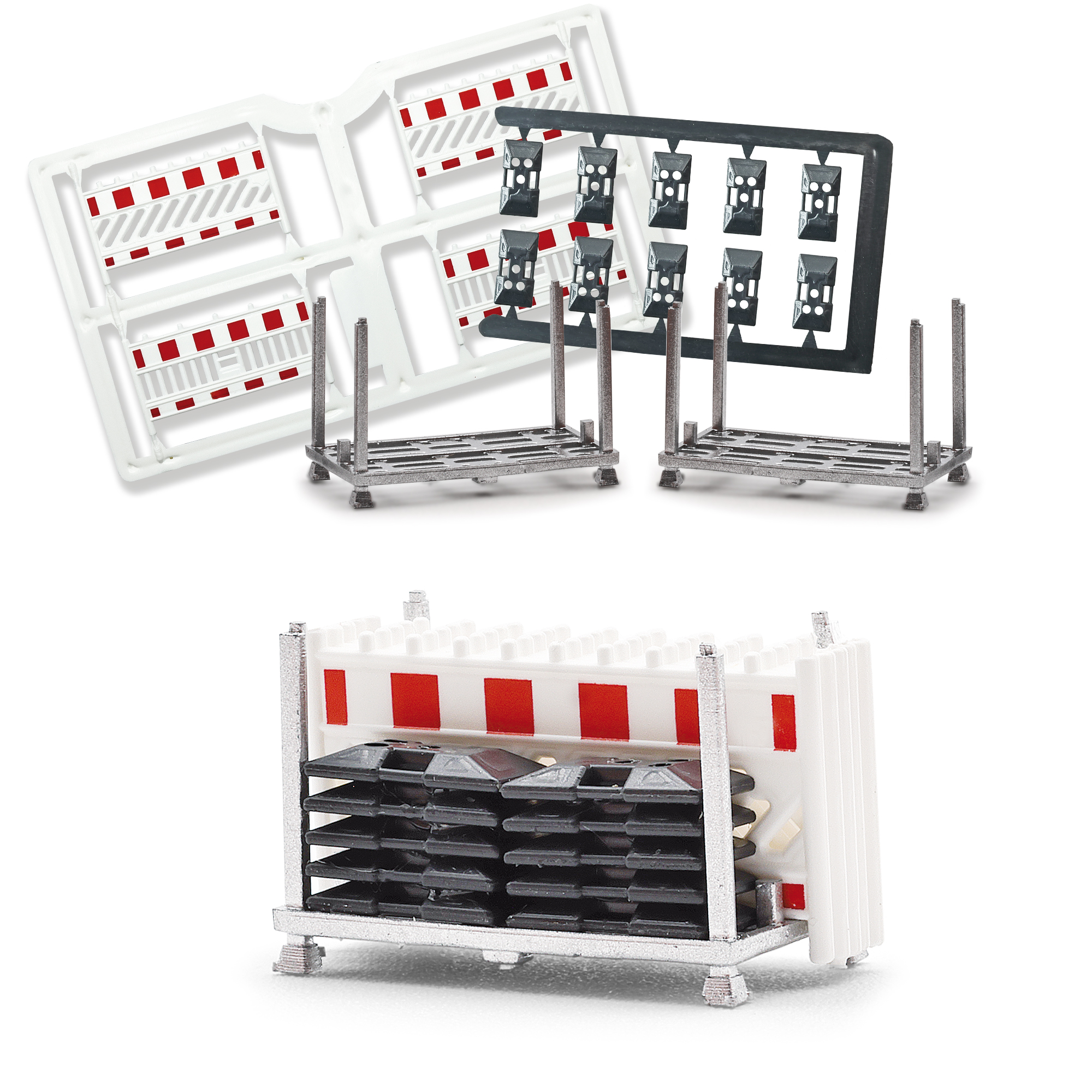 Sicherer und platzsparender Transport zur Baustelle! 4 Lager- und Transportgestelle, bestückt mit insgesamt 20 Schrankenzäunen und passenden Fußplatten. Bausatz.