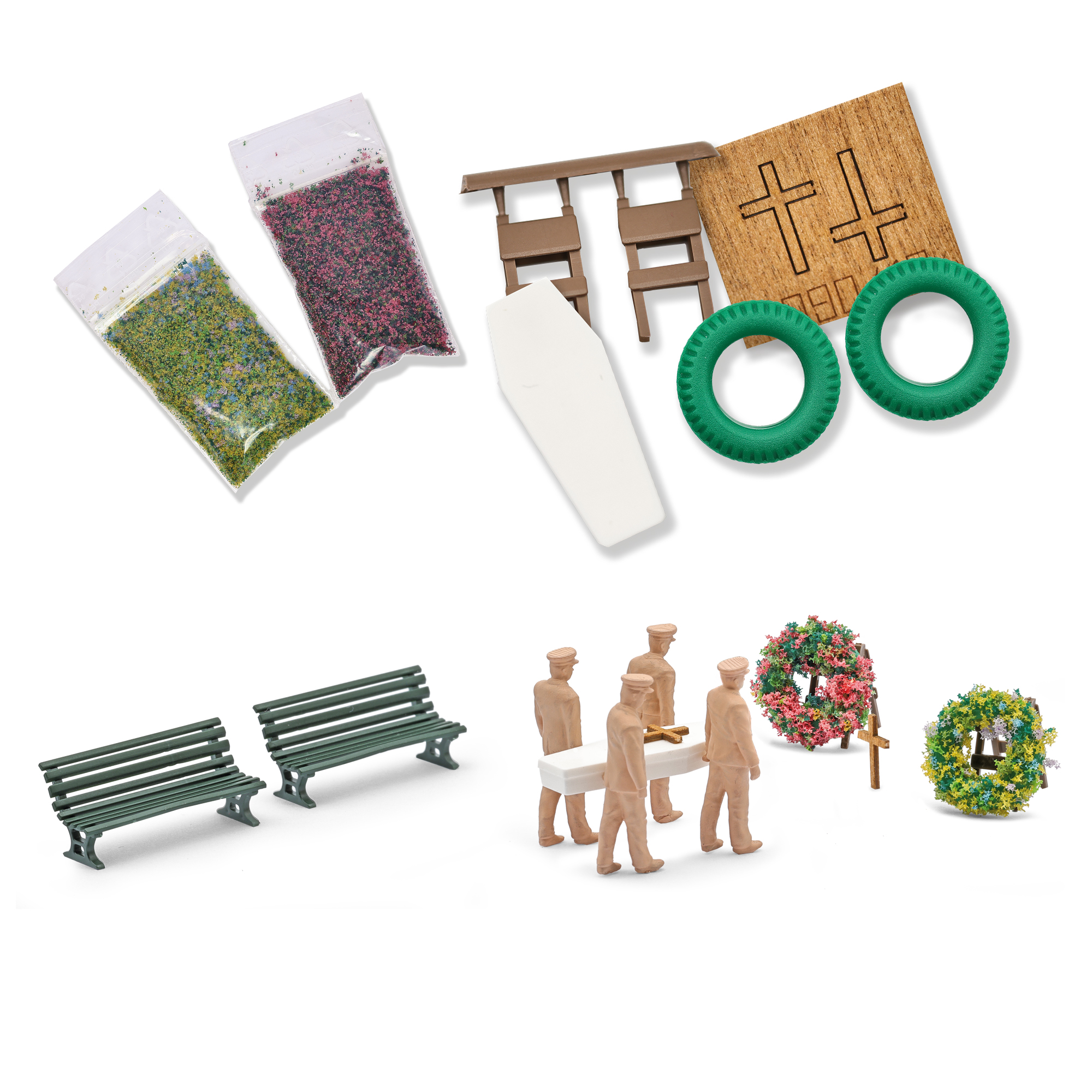»Der letzte Gang« wird hier von 4 Sargträgern (Figuren zum Selbstbemalen) dargestellt, die einen weißen Sarg tragen. Der Bausatz beinhaltet außerdem ein Holzkreuz, 2 Blumenkränze (Flockmaterial enthalten), 2 Kranzständer sowie 2 Parkbänke.