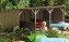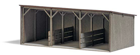 Einseitig geöffneter Unterstand für landwirtschaftliche Fahrzeuge und Zubehör auf einem Feld oder Weide.