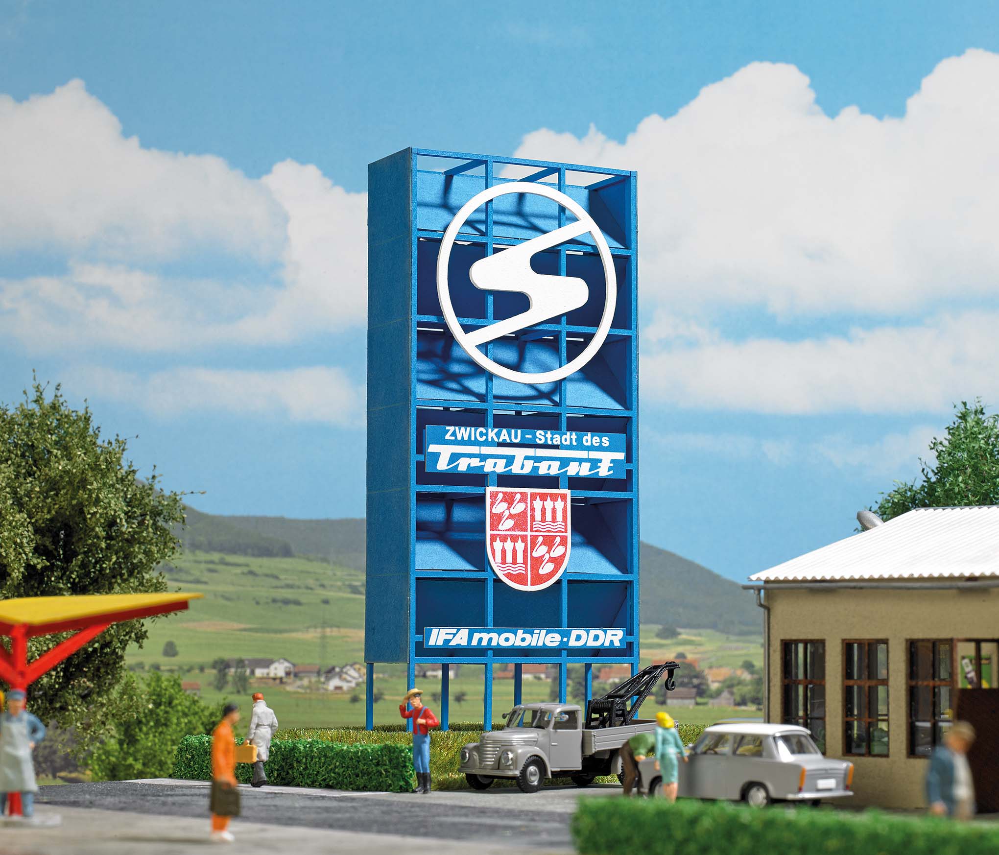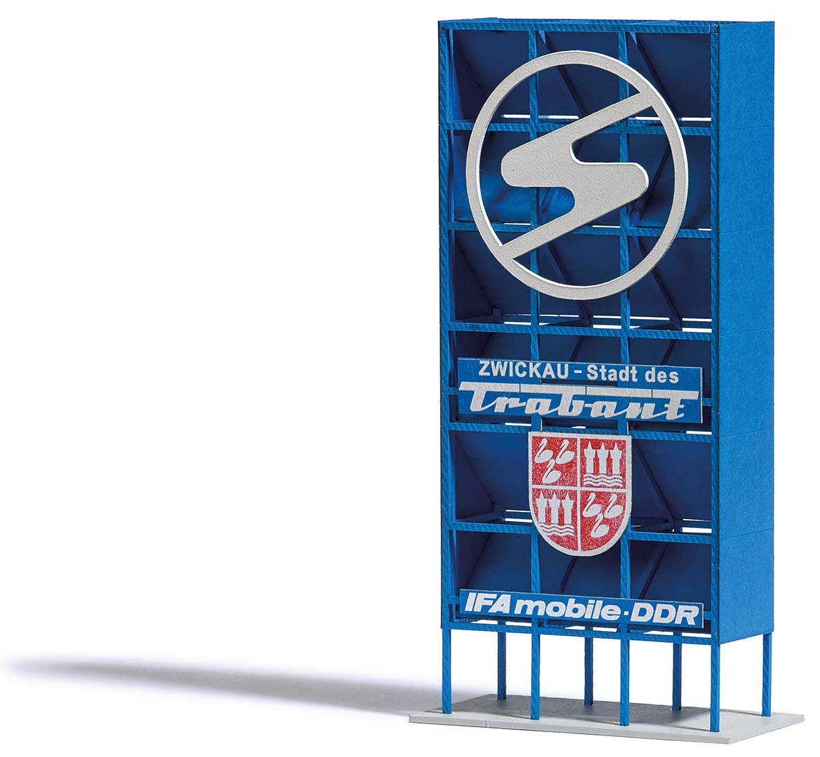 Sachsenring die Trabant-PKWs produziert wurden. Der Werbeaufsteller ist an Vorder- und Rückseite