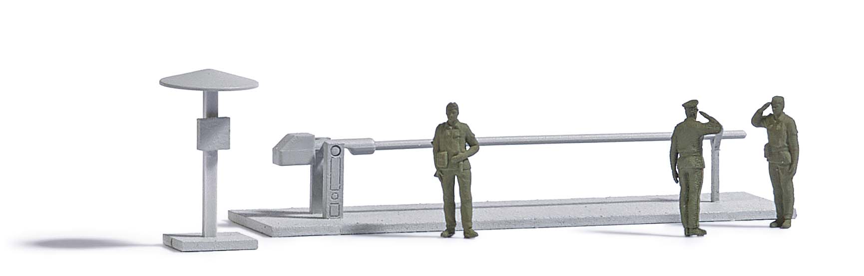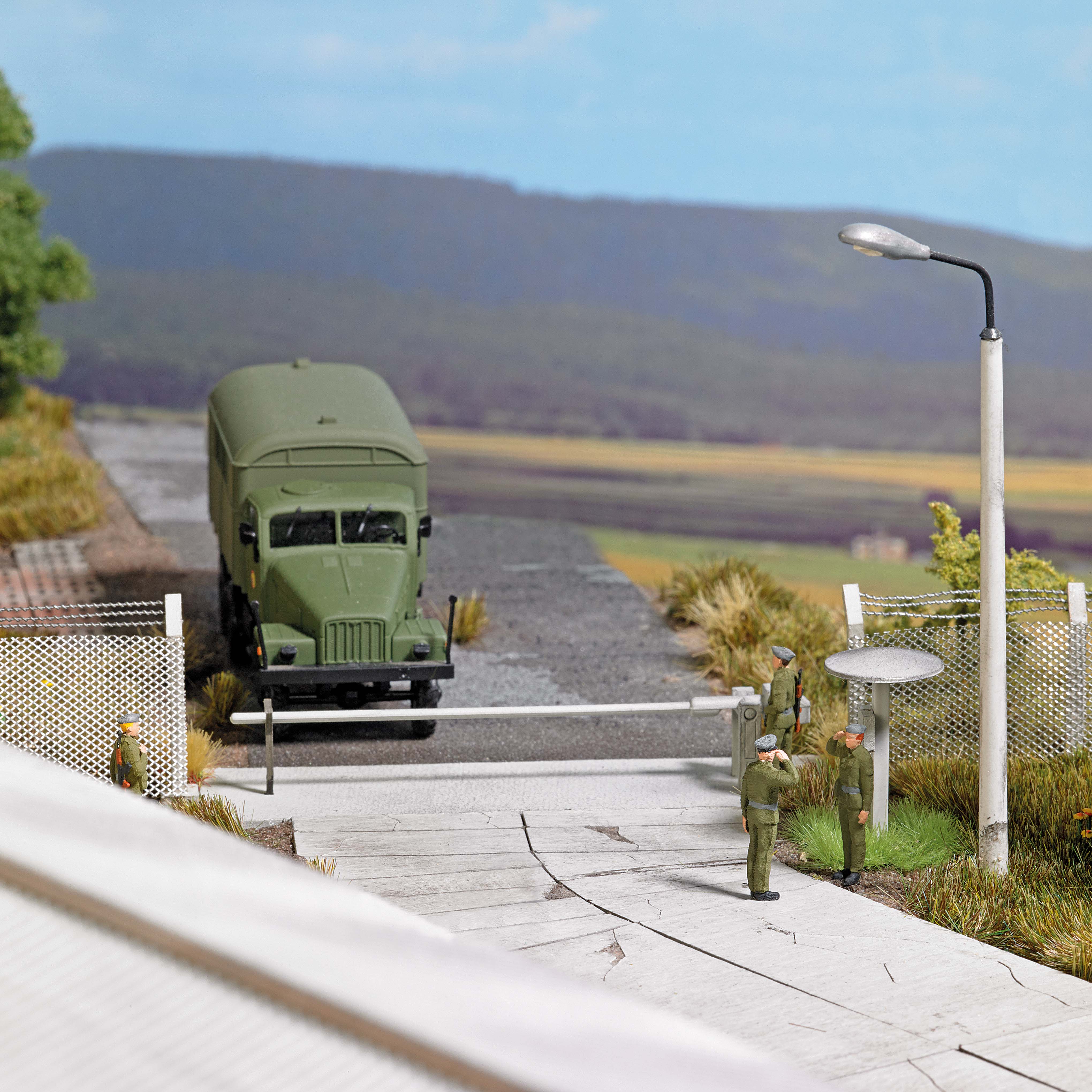 Der Kontrolldurchlass ist ein Posten zur Überwachung des Personen- und Fahrzeugverkehrs am Eingang von militärischen Anlagen. In diesem Bausatz besteht er aus einer beweglichen Schranke (Durchfahrtsbreite 60 mm) und einem einfachen Unterstand als Regenschutz für das Wachpersonal. Mit 3 NVA-Soldaten zum selbst Bemalen.
