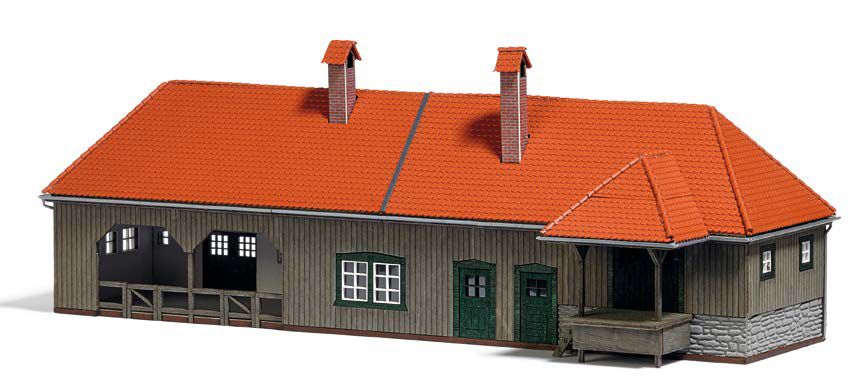 mit zusätzlichen Dachgauben. Rampen für Güterverladung an beiden Längsseiten. Filigrane Regenrinnen und Fallrohre aus Kunststoff.