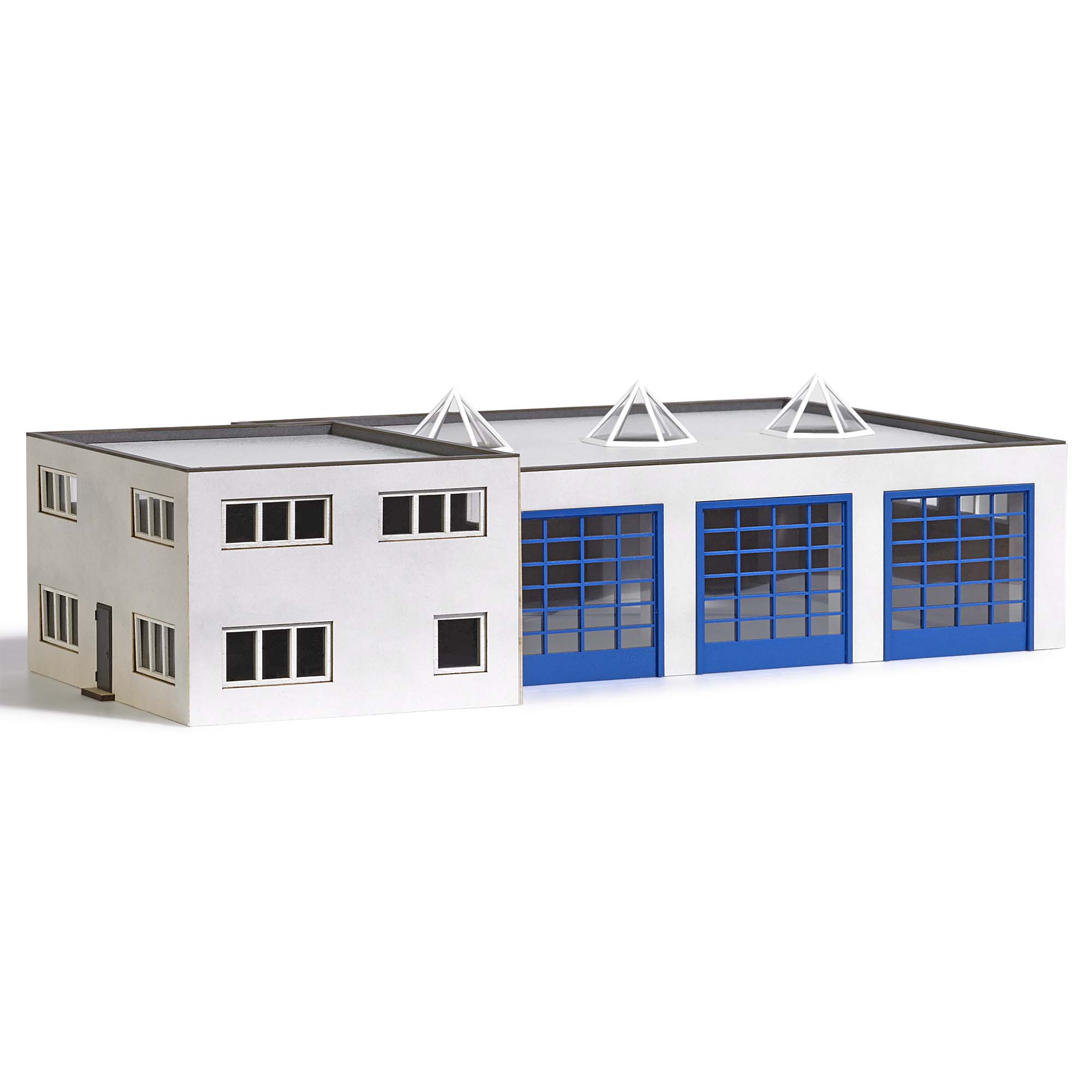 halle, Busdepot u.v.m. Drei große Einfahrten (49 x 50 mm). Umlaufende Fensterreihen an zwei Seiten des Gebäudes. Drei verglaste Oberlichter