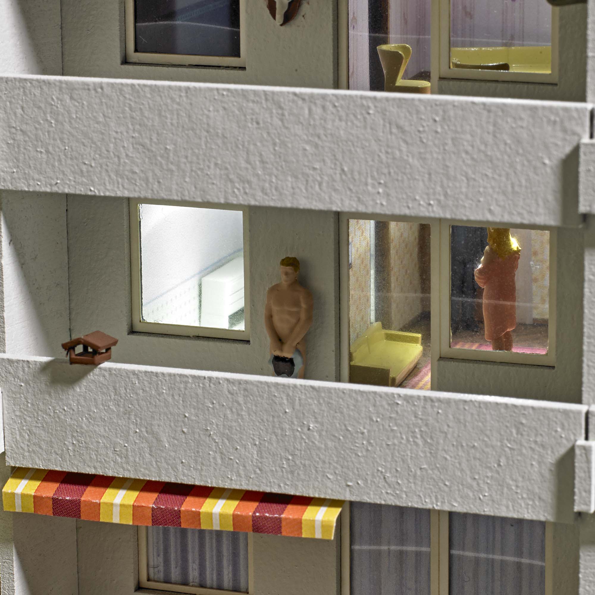 In der Szene wird ein Liebespärchen vom unerwartet nach Hause kommenden Mann überrascht. Mit Wohnzimmermöbeln und Küchenausstattung. Ausschneidebogen, 3 Figuren zum selbst Bemalen. Bausatz.