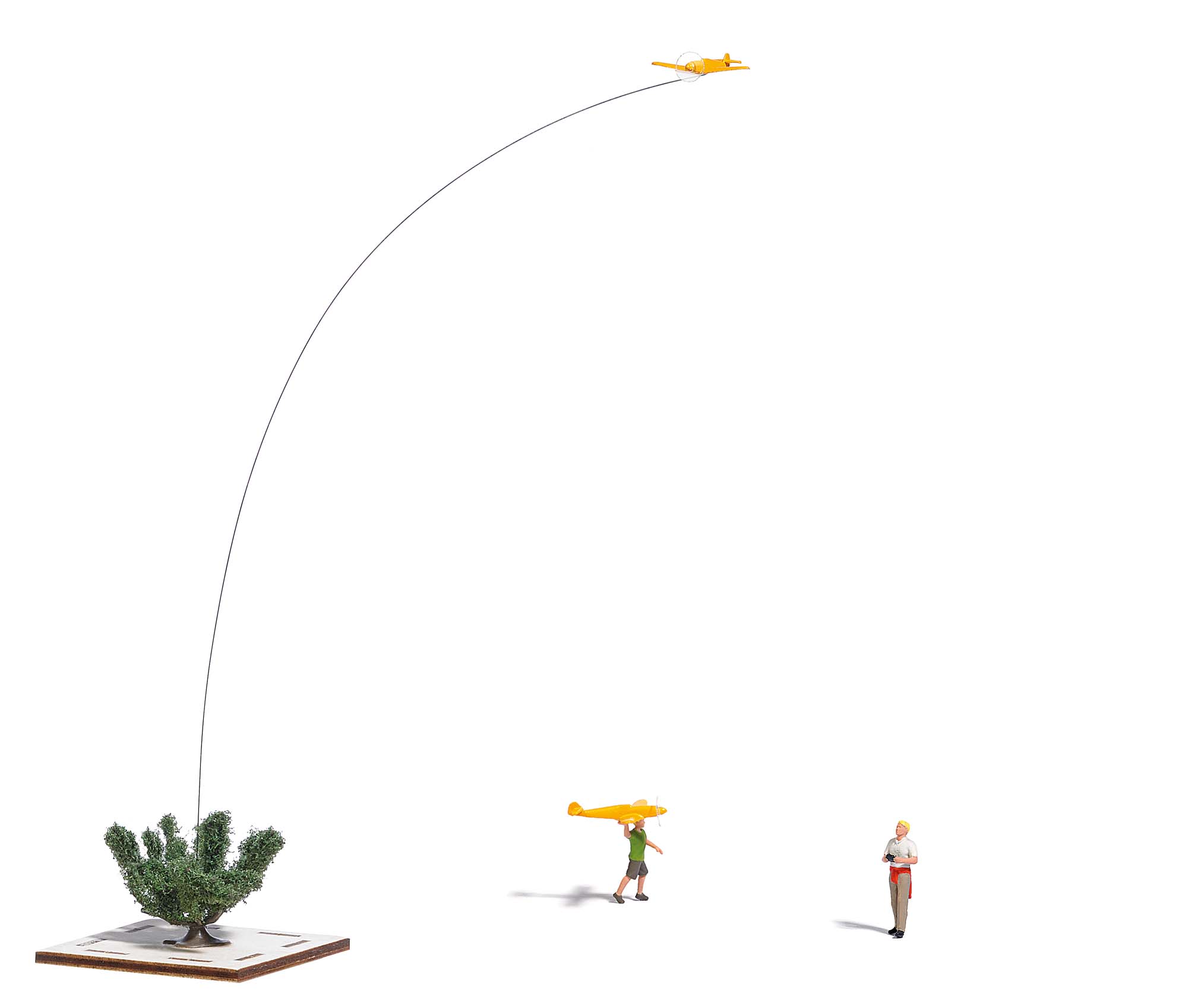 Bausatz für ein Modellflugzeug, das kreisend seine Runden dreht. Mit einem Busch, der den Antriebsmotor verdeckt. Ebenso enthalten: Mann mit Fernsteuerung und Junge mit Modellflugzeug. Anschluss an 14 - 16 V Wechselspannung. Höhe: 200 mm.