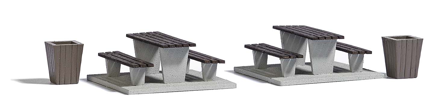 Nachbildung von Sitzgruppen aus Beton mit Tischplatten und Sitzflächen aus echtem Holz. Mit Abfallkörben. Geeignet für Parkanlagen, Autobahnrastplätze, Friedhöfe usw.