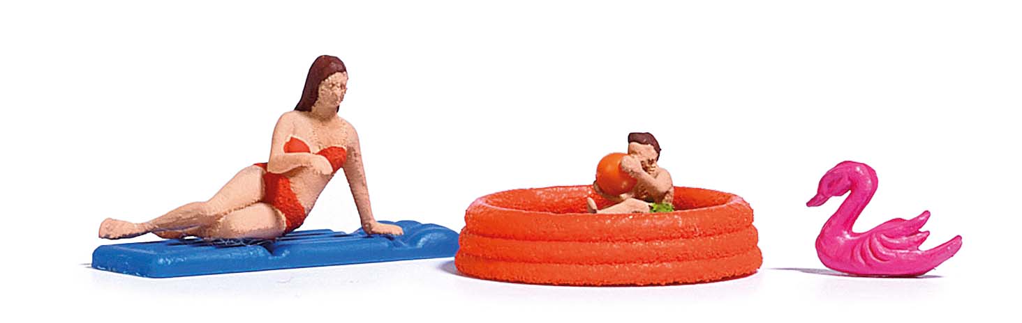 Mutter mit spielendem Kind am Planschbecken. Mit aufgeblasenem Gummischwan und Luftmatratze. Realistische Darstellung der Wasseroberfläche im Becken.
