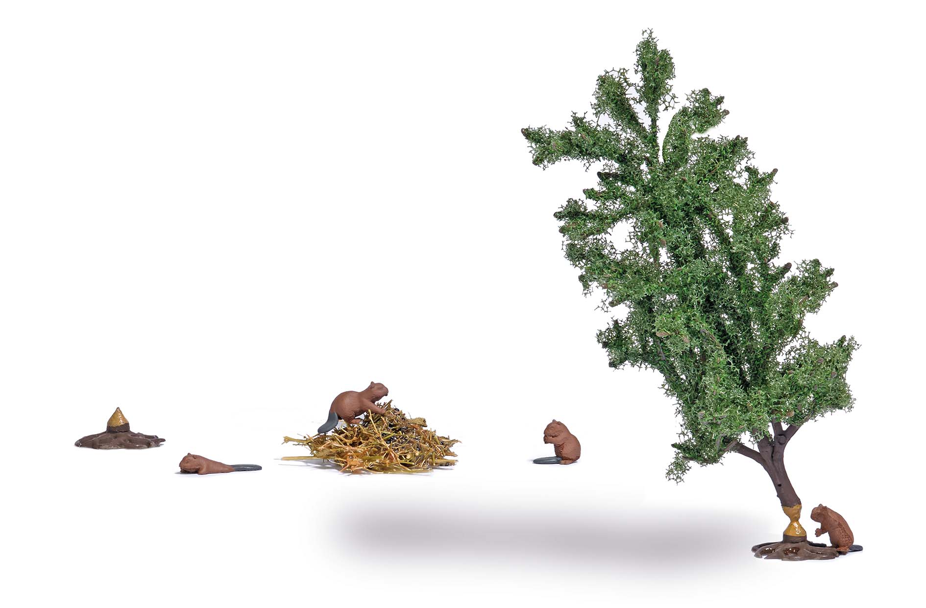 Action Set für die realistische Belebung Ihrer Modellwelt. 4 Biber, Biberburg, Wurzel und »angenagter« Baum, 90 mm hoch.
