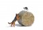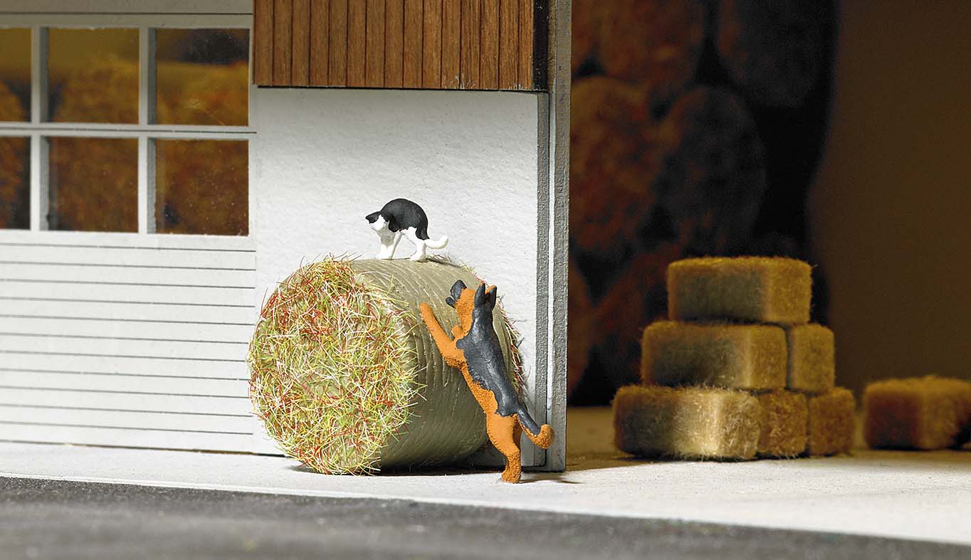 Hund, der eine Katze auf einer Strohrolle jagt. Mit passender Bodenplatte.