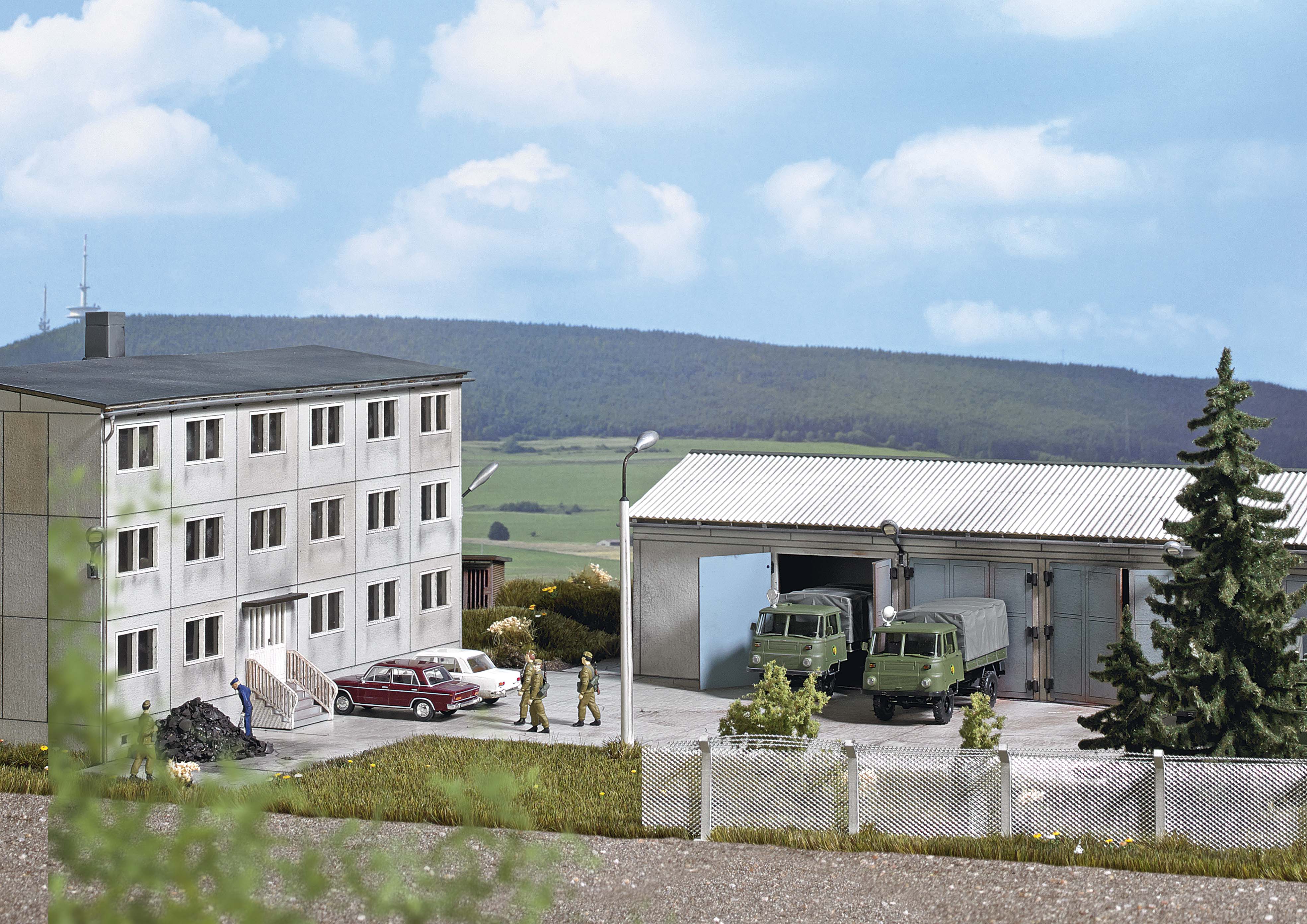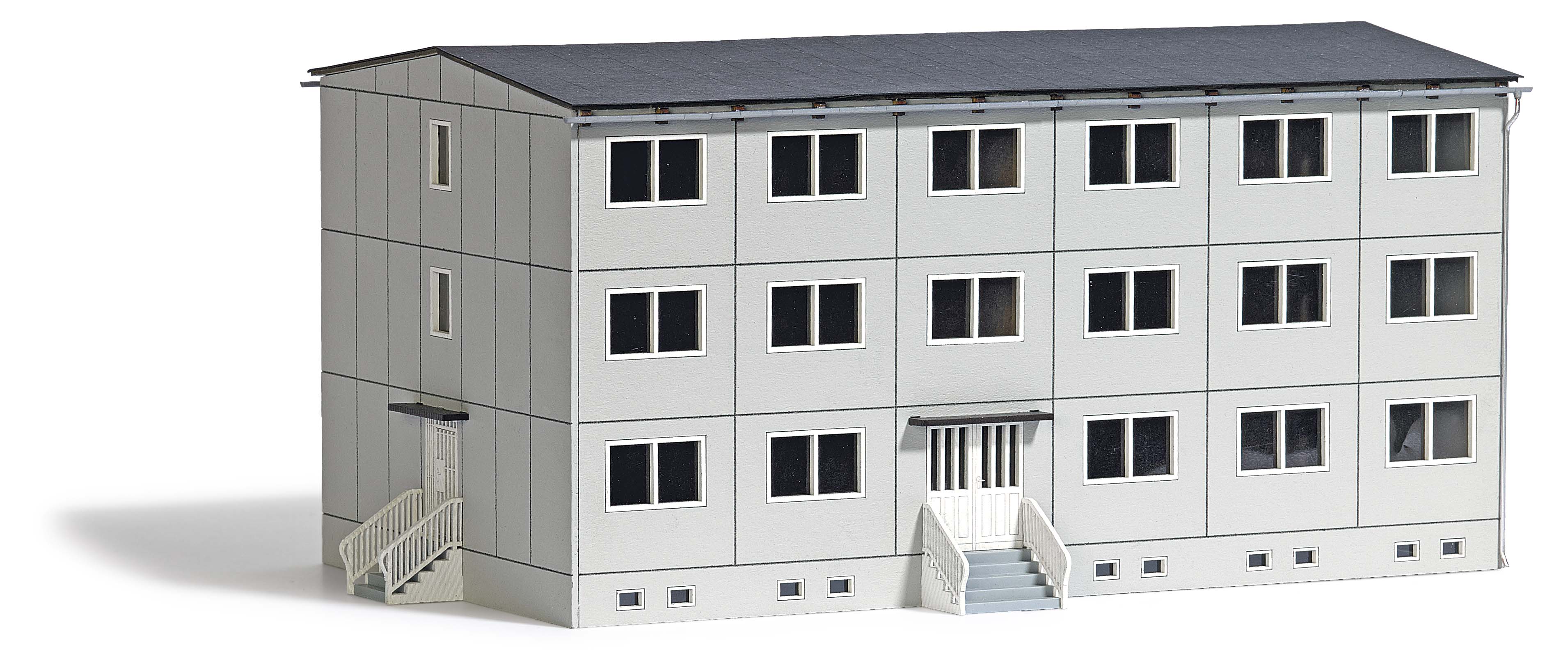 Bausatz. Mehrstöckige Unterkunft in realistischer Nachbildung der Betonbauweise. Überdachte Treppenaufgänge an 2 Seiten des Gebäudes.