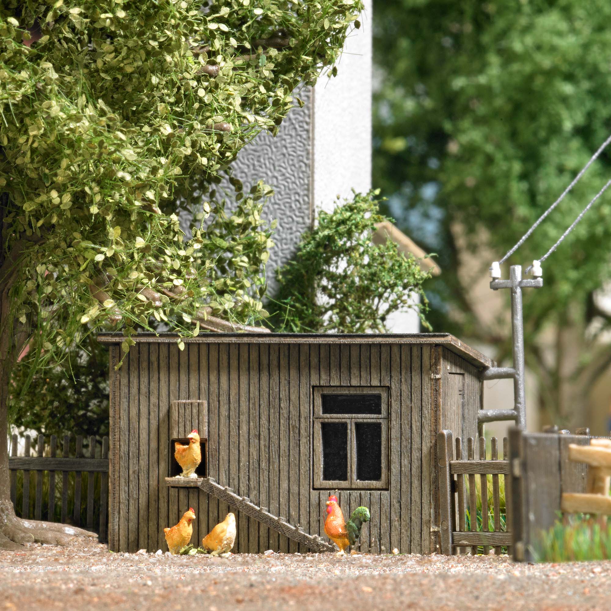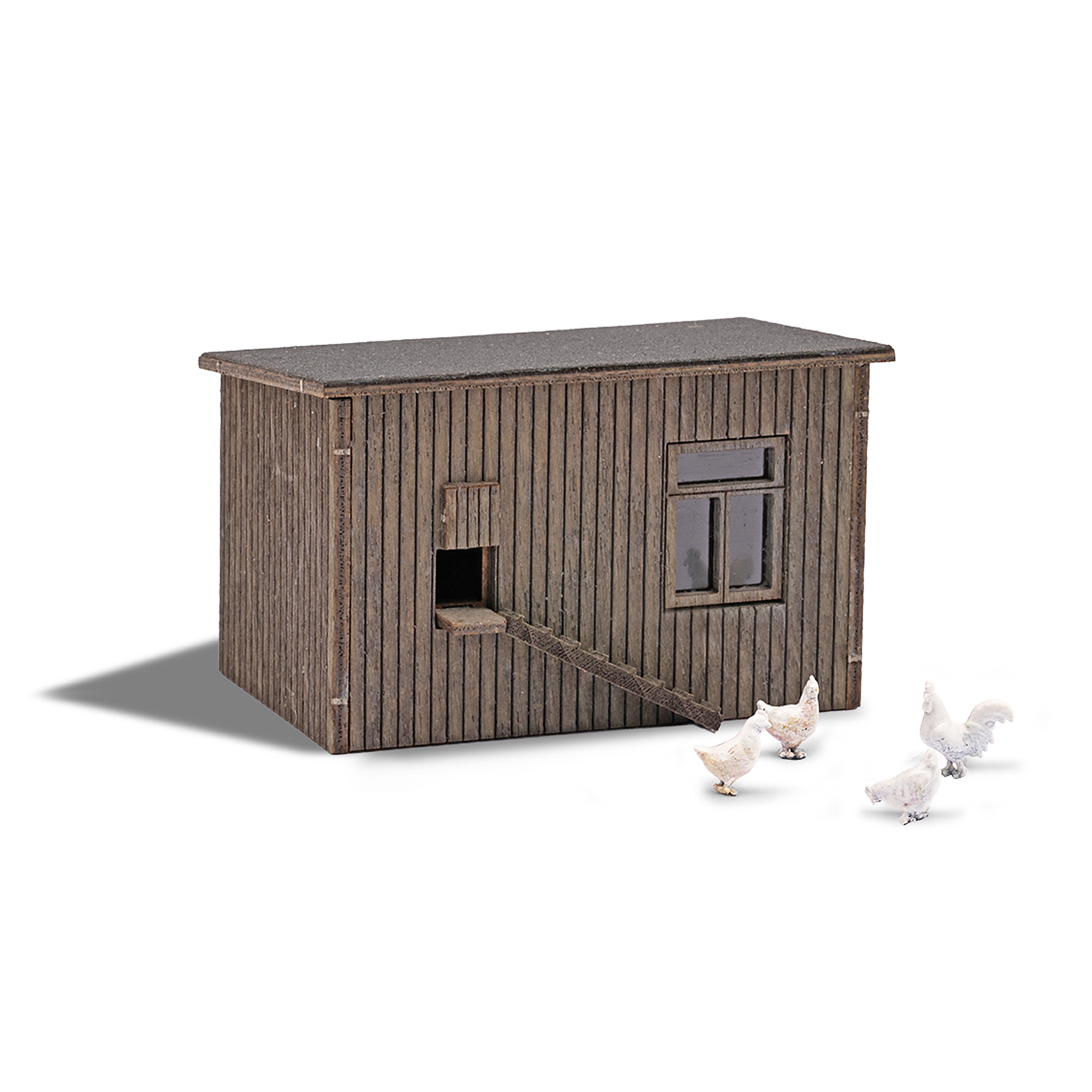 »Kikeriki« ruft es aus dem Hühnerstall. Hier wohnen ein stolzer Hahn und 3 Hennen (zum selbst Bemalen). Der Bausatz ist aus echtem Holz gefertigt und mit Hühnerleiter, Einstiegsluke und Fenster ausgestattet. Größe TT: 31 x 21 mm, 20 mm.
