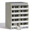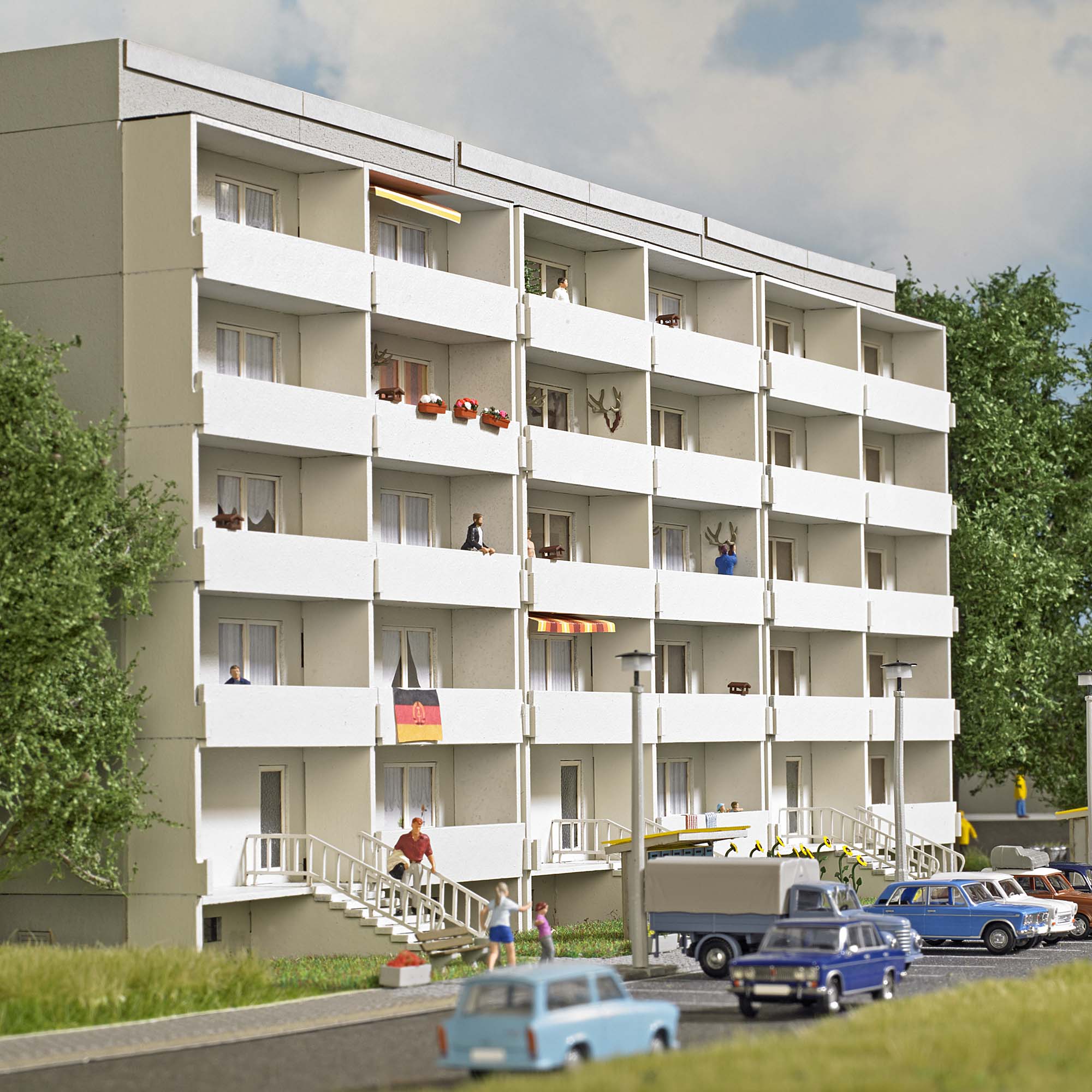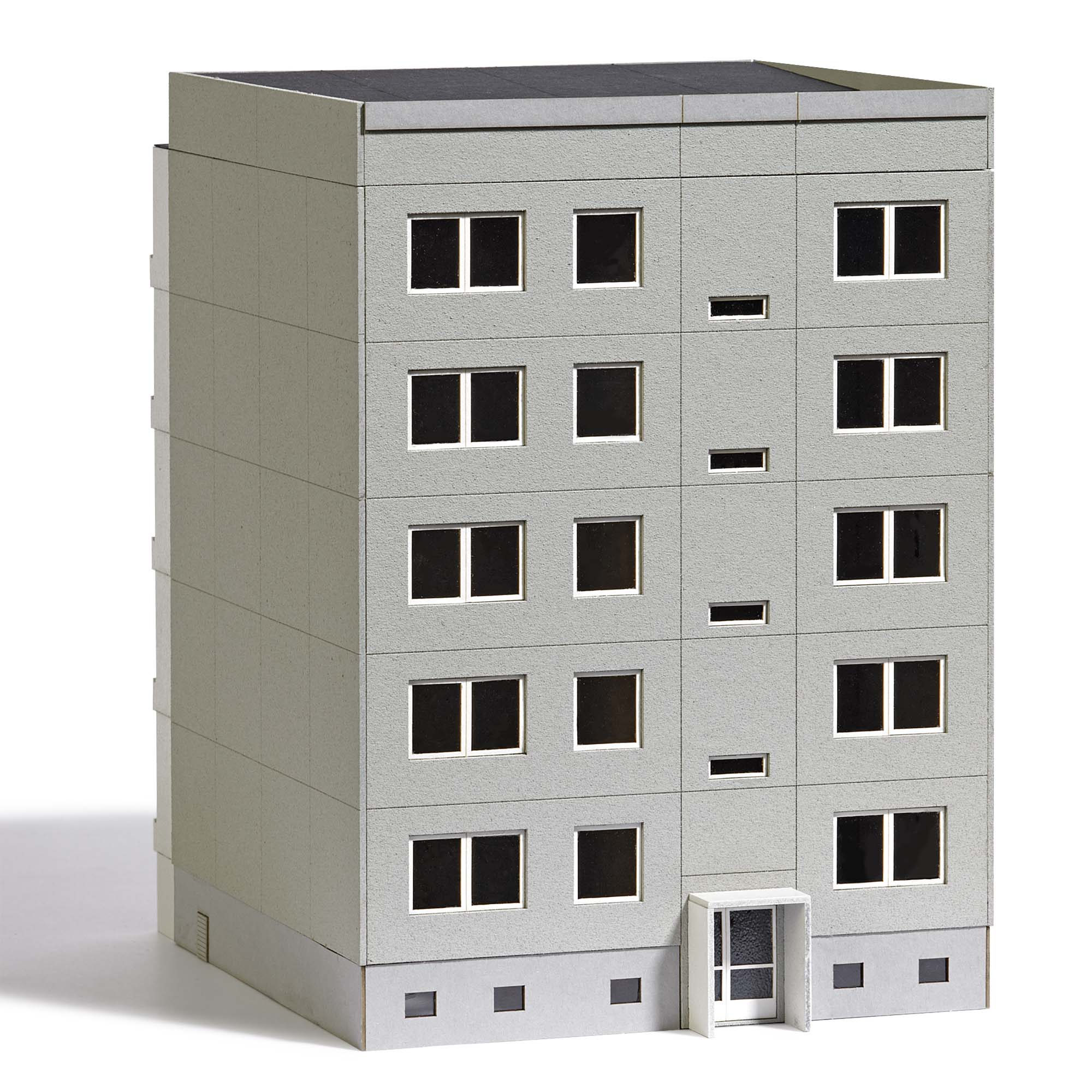 Bausatz für ein 5-stöckiges Gebäude mit Eingang und Windfang auf der Vorderseite sowie Balkonen und Treppe auf der Rückseite.