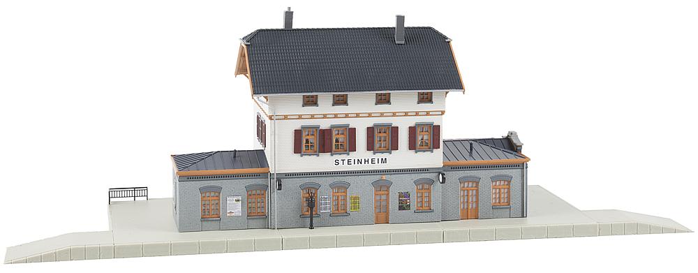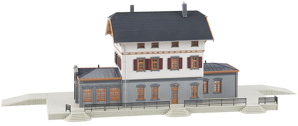 Stationsgebäude im Landhausstil der württembergischen Einheitsbahnhöfe mit einem dreigeschossigen, in den Obergeschossen schindelverkleideten Mittelbau mit hellem Anstrich und einem mit Falzziegeln bedeckten, hervorkragenden Krüppelwalmdach. Das Erdgeschoss und die zwei seitlichen, mit Zinkblech gedeckten Anbauten, die ursprünglich als Wartehalle und Güterschuppen genutzt wurden, sind gemauert. Als Fundament dient ein zur Straßenseite hin mit Werksteinen verblendeter Betonsockel mit Stufen, Rampe, Geländer und Bahnsteig.