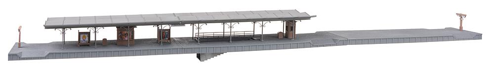 Überdachter Bahnsteig in filigraner Gusseisenkonstruktion mit Personenabgang. Zahlreiches Ausschmückungszubehör, wie z.B. Kiosk, Aufsichtsbude, Zugzielanzeiger, Sitzbänke und Abfallkörbe liegen dem Bausatz bei. Der Bahnsteig passt ideal zum Bahnhof »Friedrichstadt«, Art. 190297.